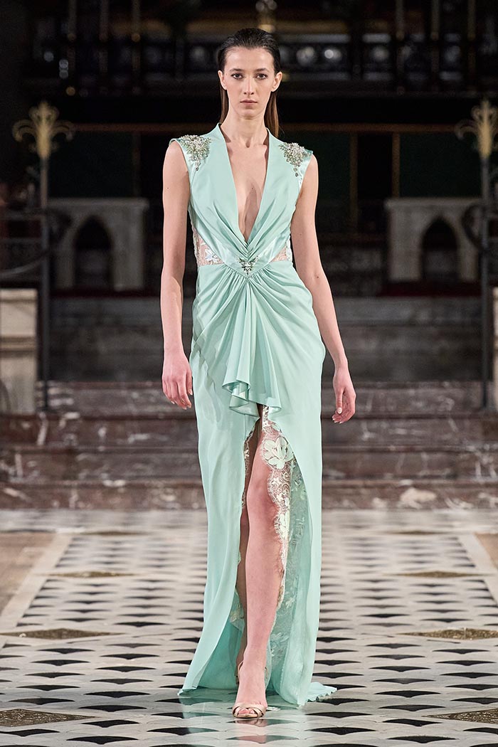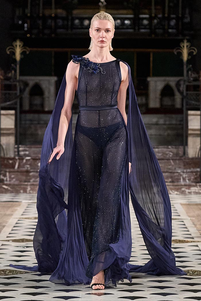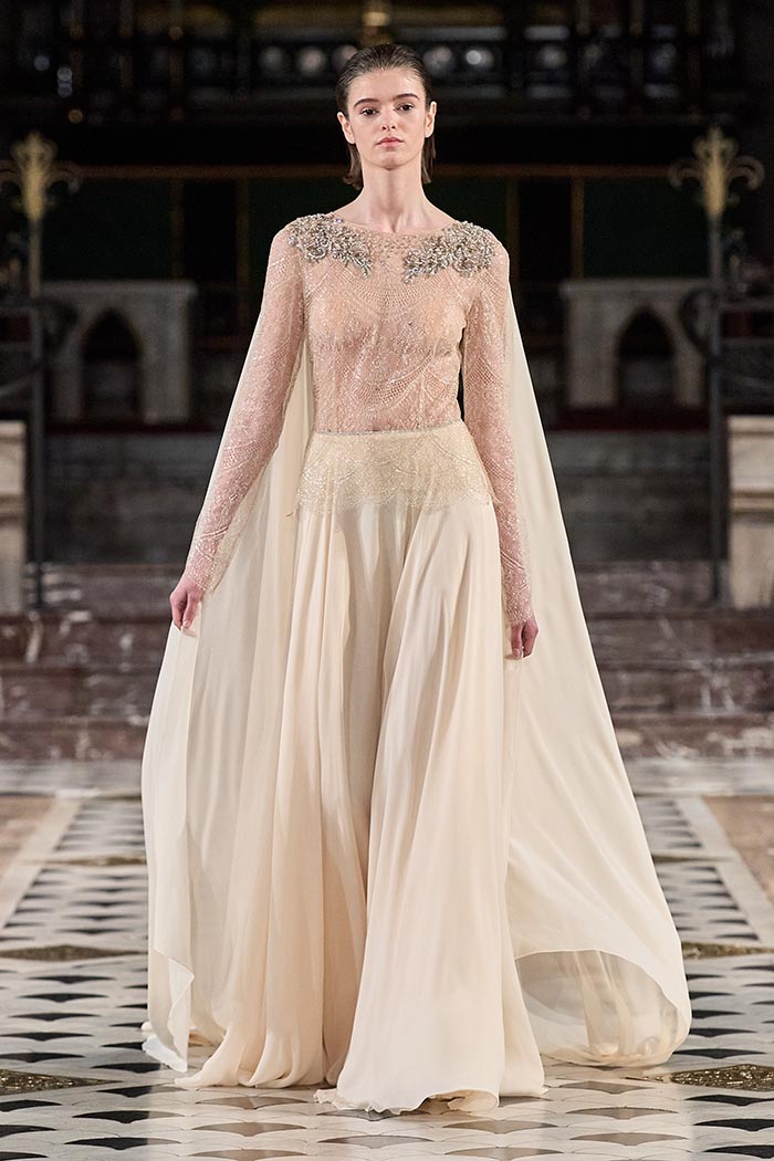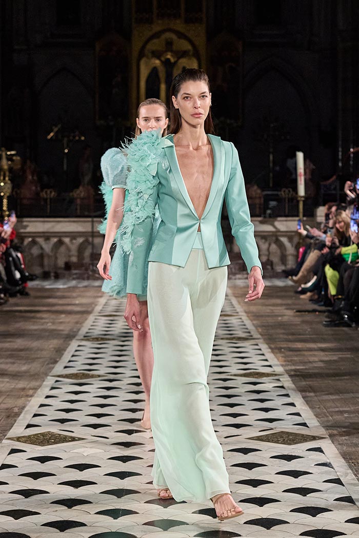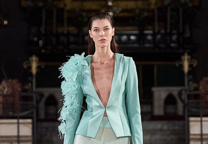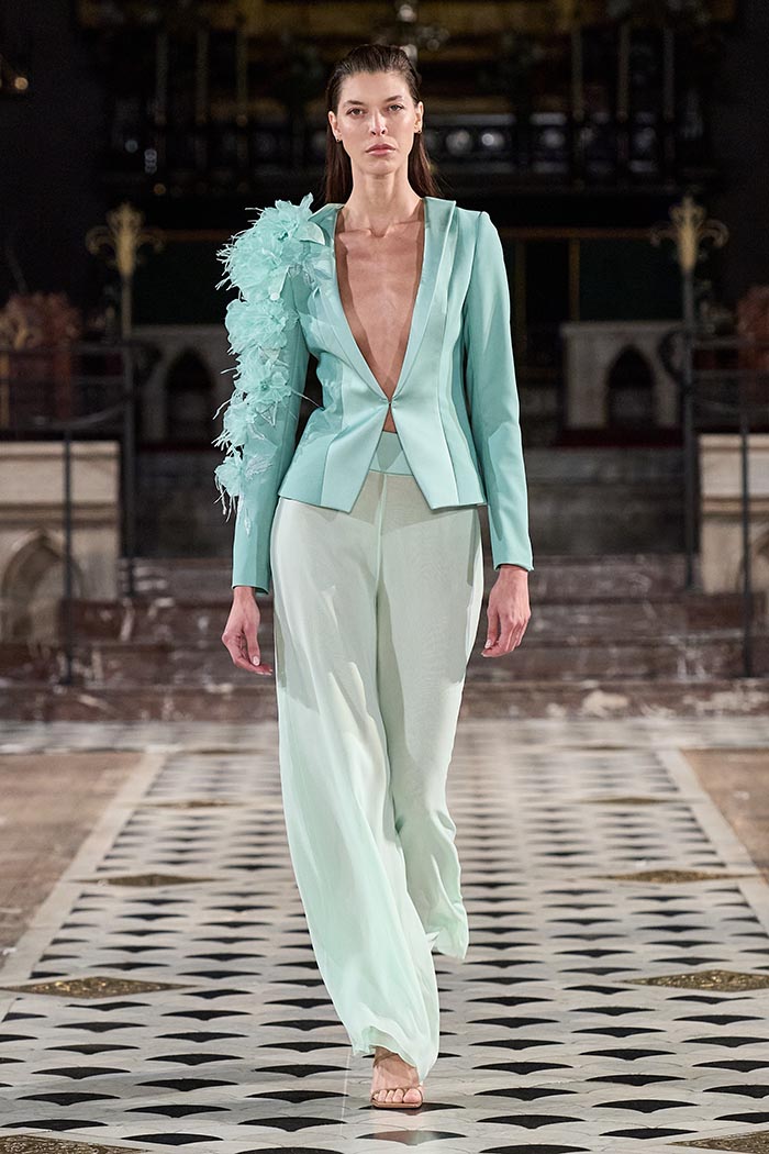 An additional element are handbags made of feathers which are complemented with stones. From shades of grey we move to sparkling navy blues in this pantsuit with silk chiffons complemented by floral appliqués. Mint greens appear in the collection, complemented by ostrich sleeves and hand-made 3D applications in floral forms and champagne gold like the rising sun. The culmination of the collection is the final dress made of silver lace with embroidery designed by La Metamorphose made in Atelier Lesage. There are 3D butterflies in delicate organza and beads and crystal appliqués in a floral design. Butterflies gently touch the shoulder as if they had awakened to a new life after a night full of magic and mystery. The final dress refers to the Lady of the Night, which brings hope and love, making us look forward to the next day. A day that will be the beginning of a beautiful new path. The dress is made of 40 metres of Mikado and 30 metres of lace with luminous crystals. The collection also includes Solstiss lace, Goutarel tulles and silk chiffons.
