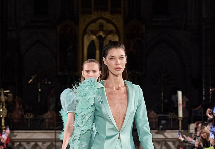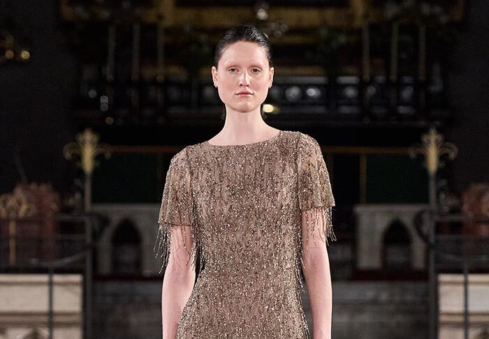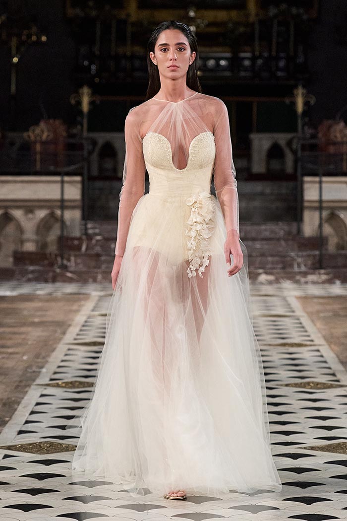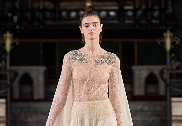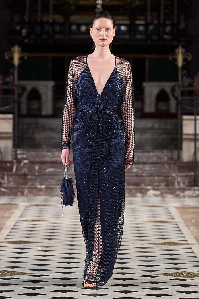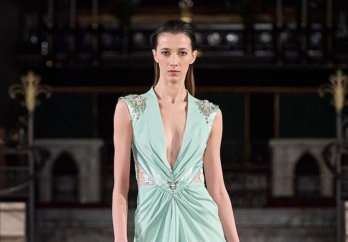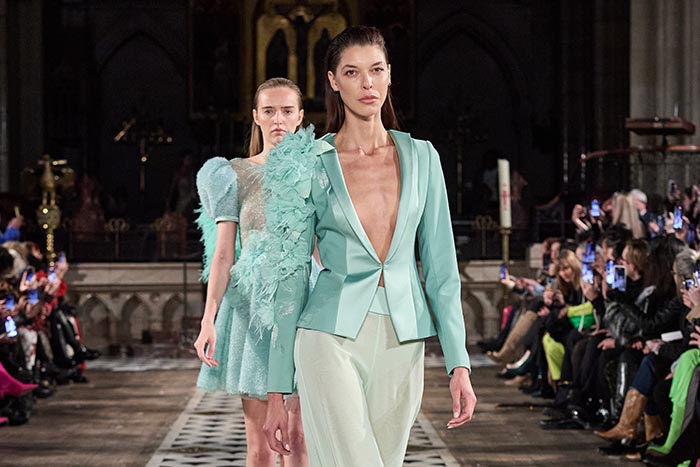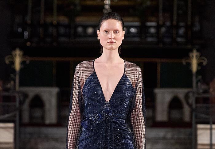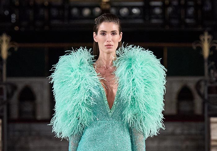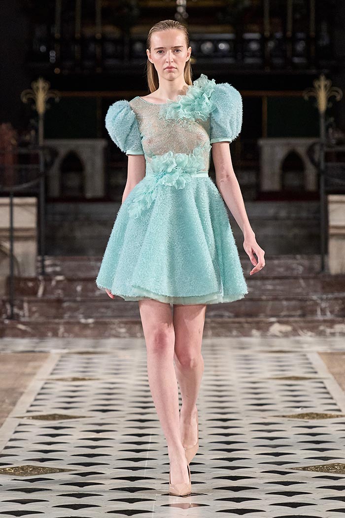 An additional element are handbags made of feathers which are complemented with stones. From shades of grey we move to sparkling navy blues in this pantsuit with silk chiffons complemented by floral appliqués. Mint greens appear in the collection, complemented by ostrich sleeves and hand-made 3D applications in floral forms and champagne gold like the rising sun. The culmination of the collection is the final dress made of silver lace with embroidery designed by La Metamorphose made in Atelier Lesage. There are 3D butterflies in delicate organza and beads and crystal appliqués in a floral design. Butterflies gently touch the shoulder as if they had awakened to a new life after a night full of magic and mystery. The final dress refers to the Lady of the Night, which brings hope and love, making us look forward to the next day. A day that will be the beginning of a beautiful new path. The dress is made of 40 metres of Mikado and 30 metres of lace with luminous crystals. The collection also includes Solstiss lace, Goutarel tulles and silk chiffons.
