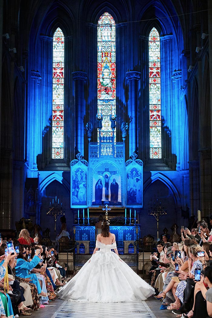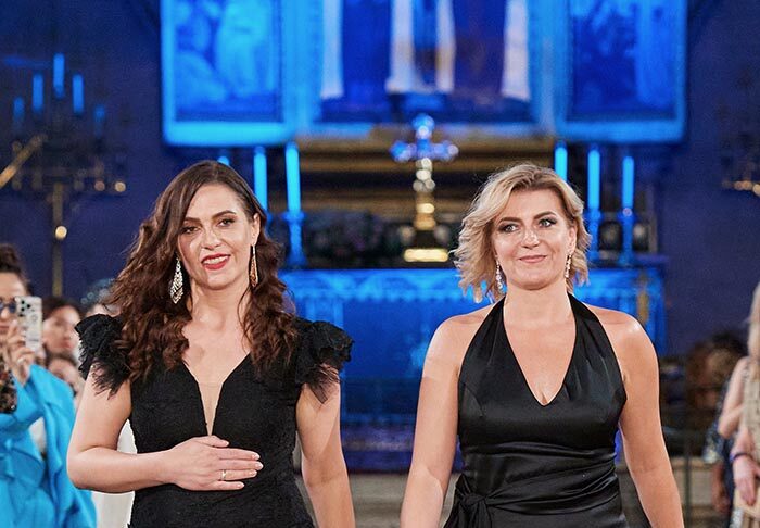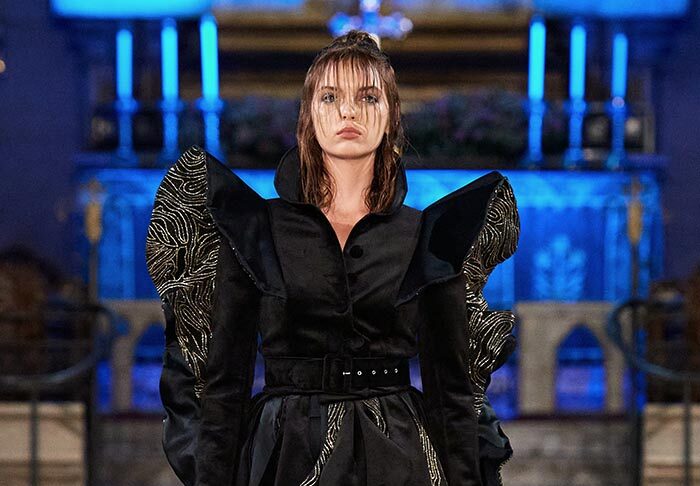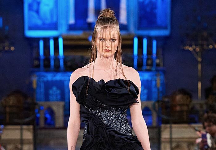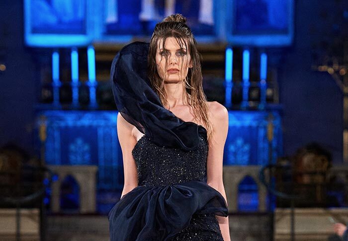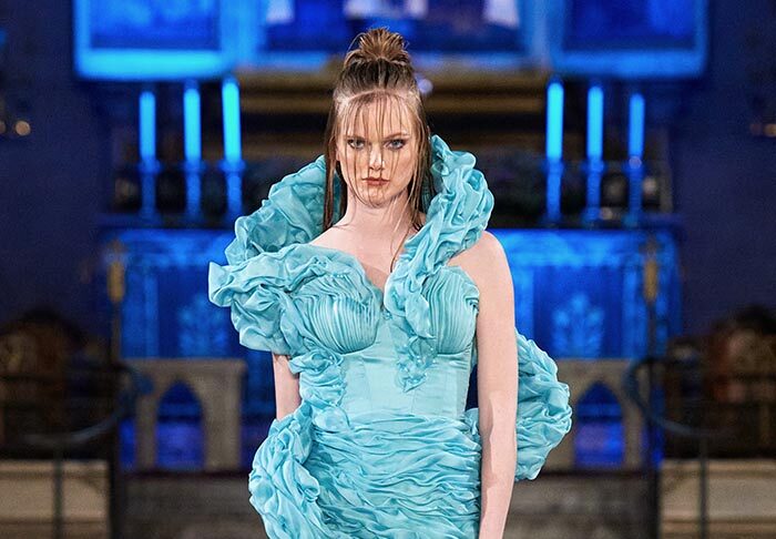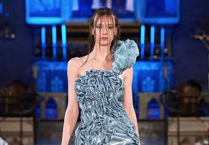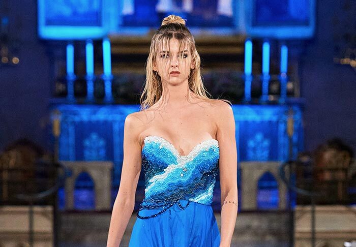 The culmination of the collection is a white dress shimmering like the blue surface of water, which is the beginning of new life and infinity. The collection includes the colours of blue, navy