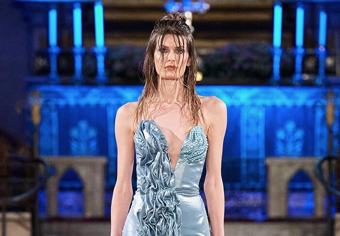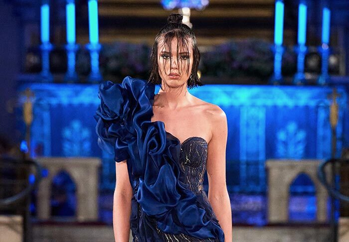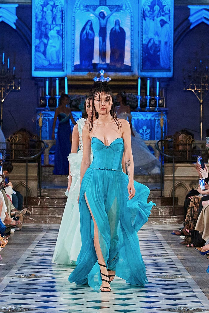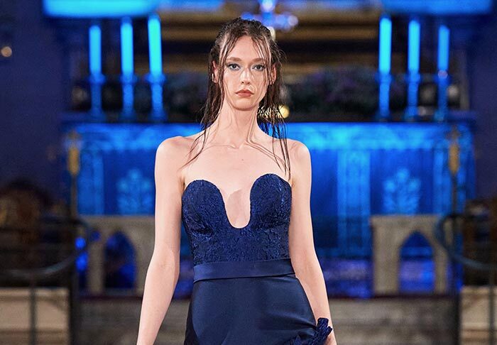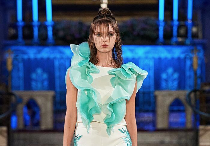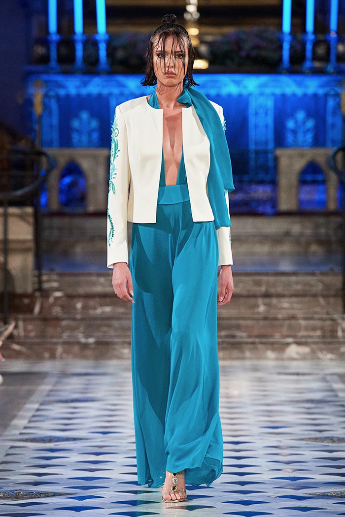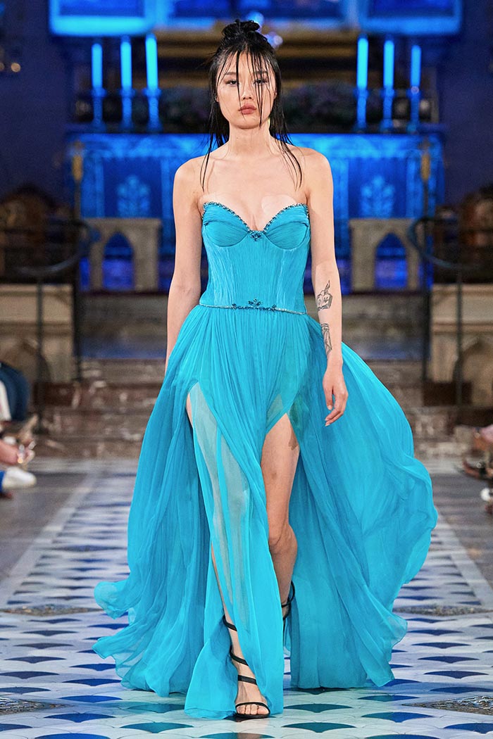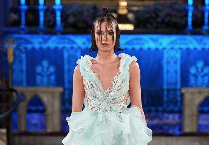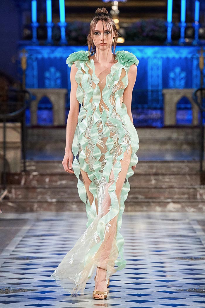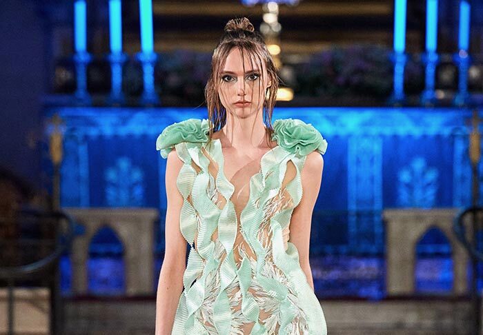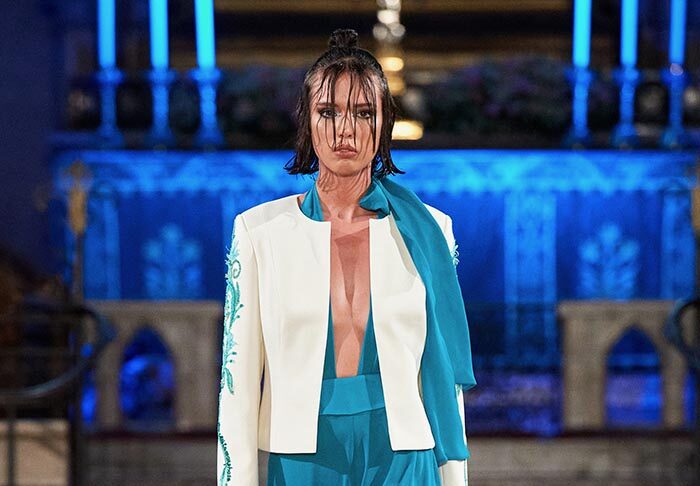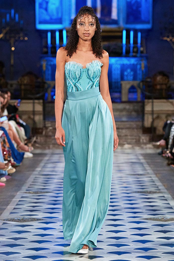 The collection consists of 25 models including chiffon dresses complemented by corsets embroidered with our pearl patterns, jackets and pantsuits embroidered in a pattern symbolising La Métamorphose. A dress that is like the blue of the ocean. New materials draped in 3D forms without using prints but only through hand sewing and creative designs.