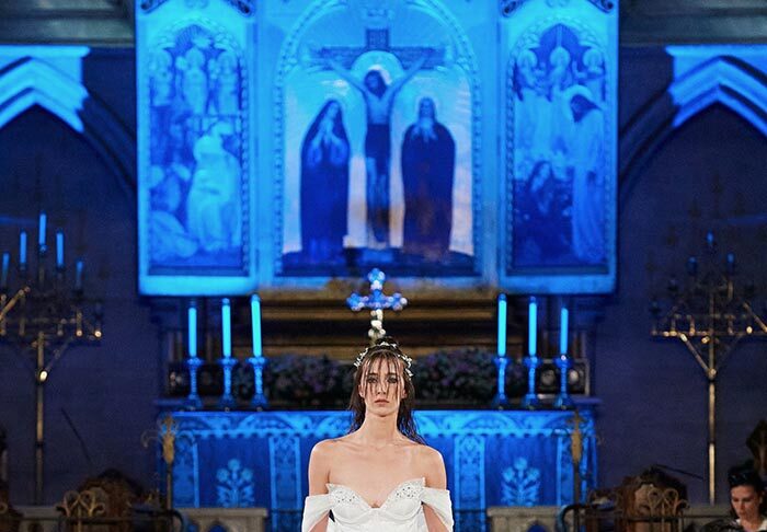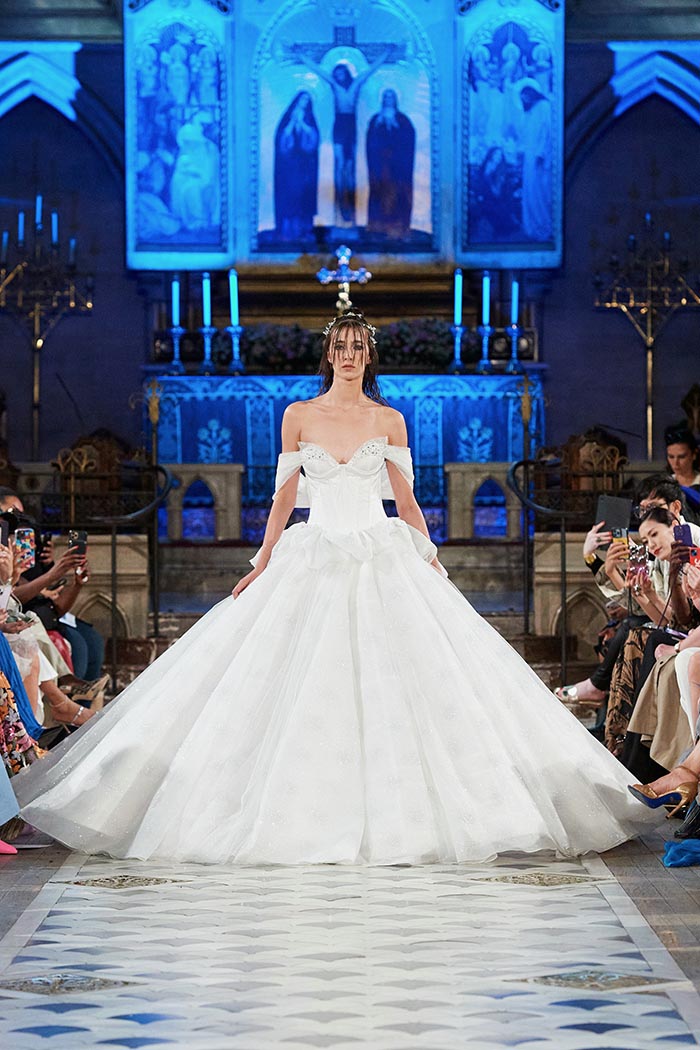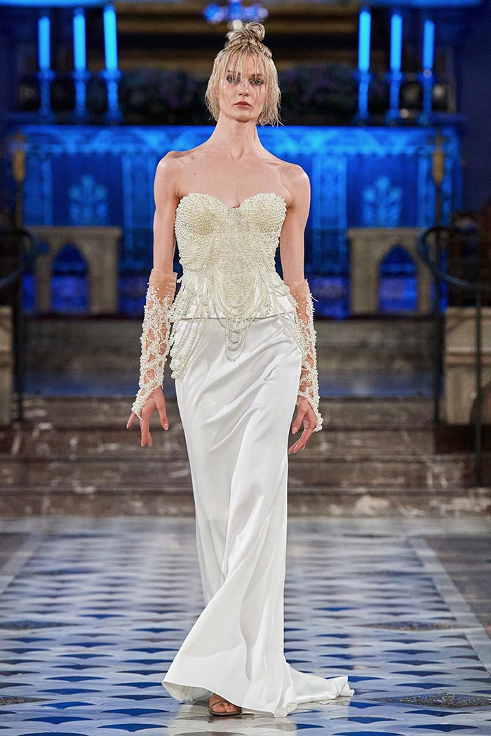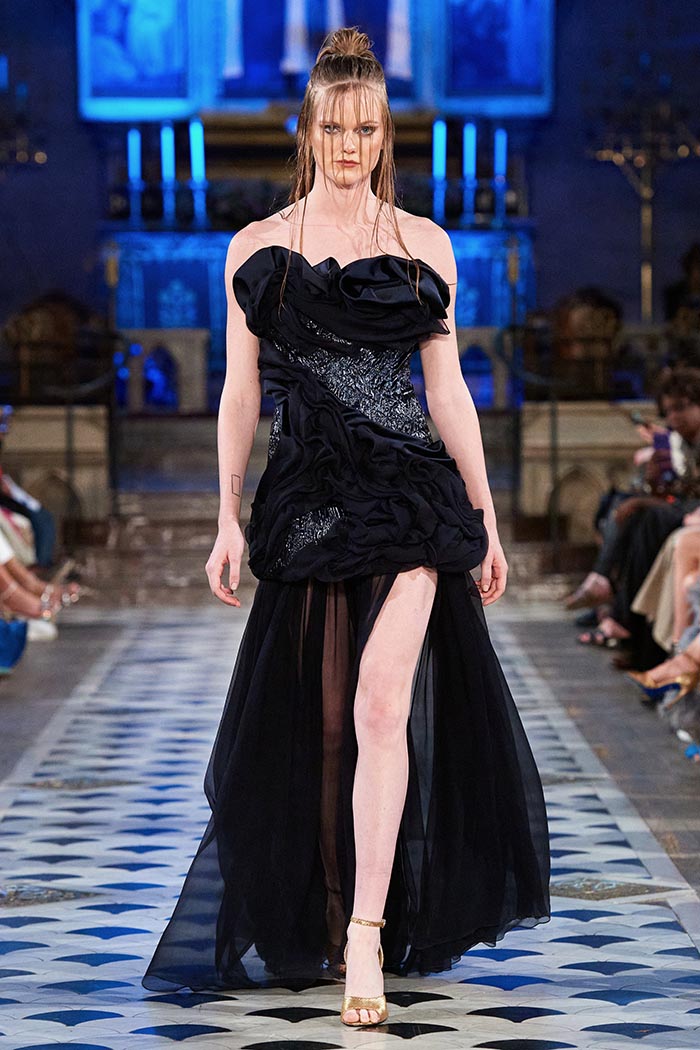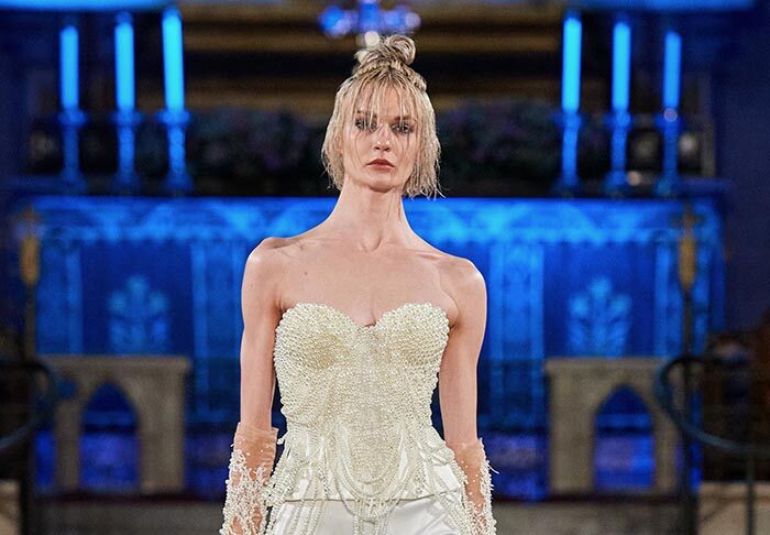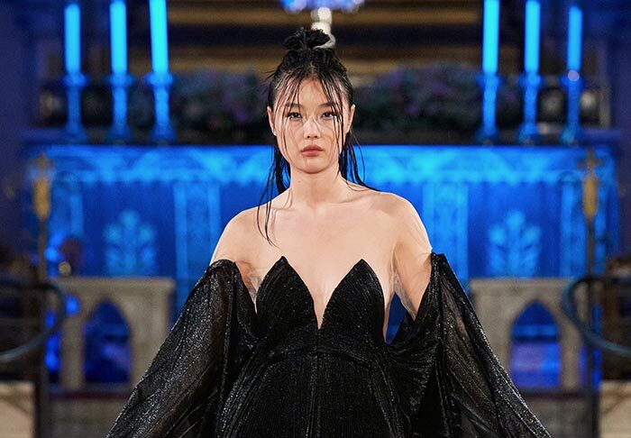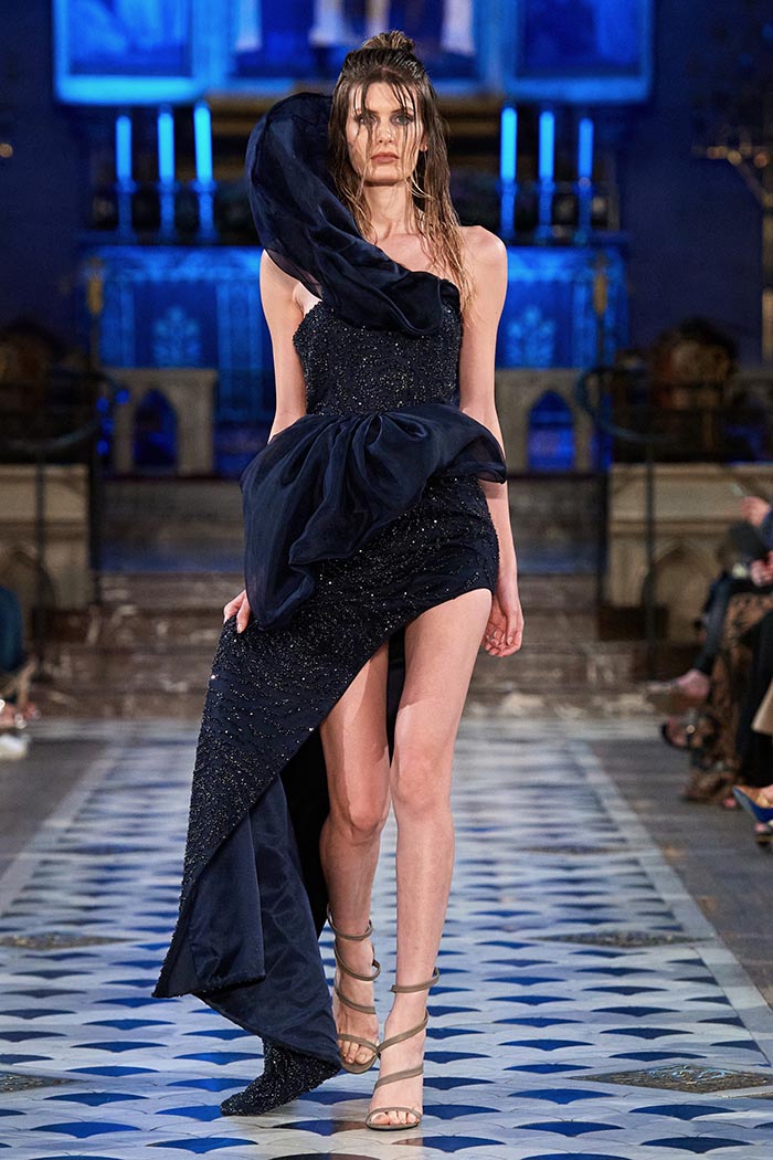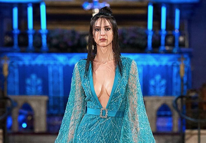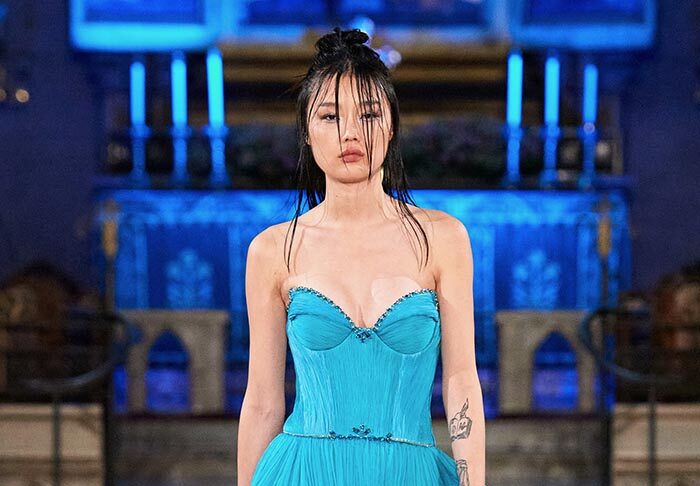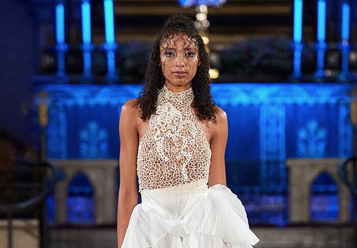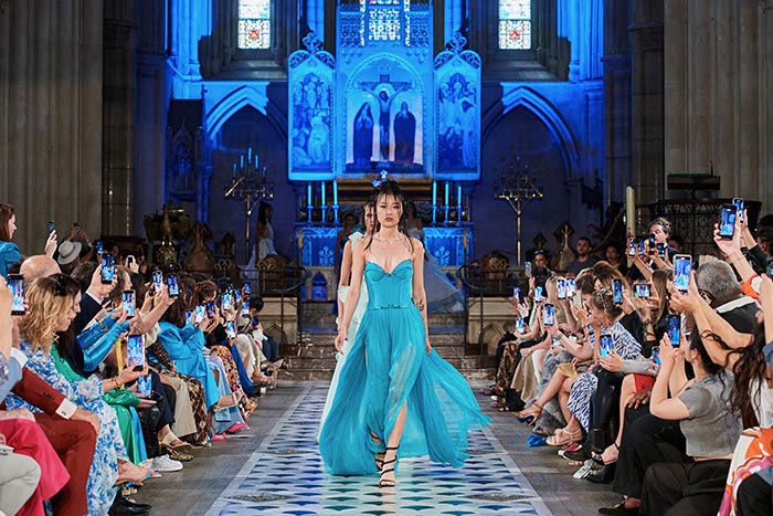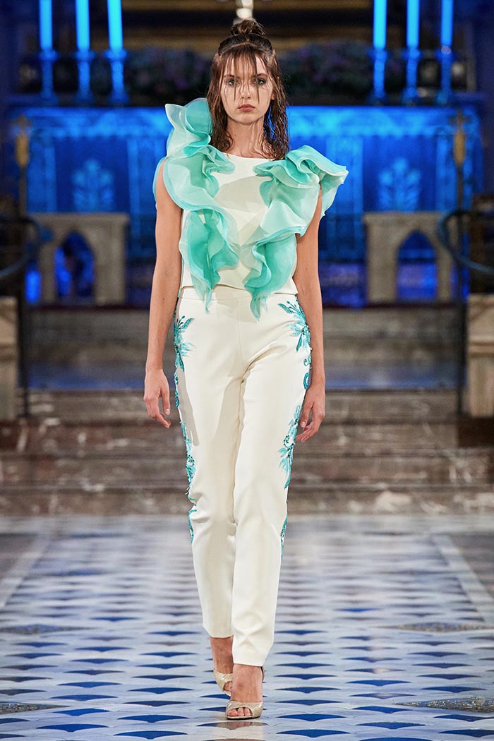 The collection consists of 25 models including chiffon dresses complemented by corsets embroidered with our pearl patterns, jackets and pantsuits embroidered in a pattern symbolising La Métamorphose. A dress that is like the blue of the ocean. New materials draped in 3D forms without using prints but only through hand sewing and creative designs.