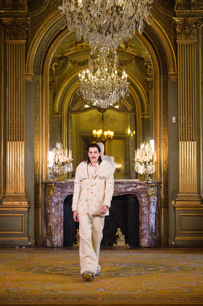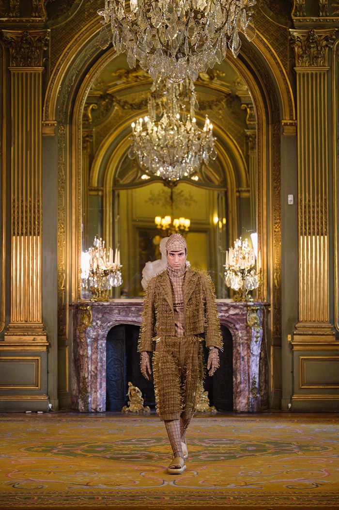 The most prominent materials in the collection will be cotton twill, quilted fabrics, jacquards woven with garment prints, fabrics made on handlooms, leather-based suits, and tailoring wool, gold embroidery, and crochet made with metal chains.