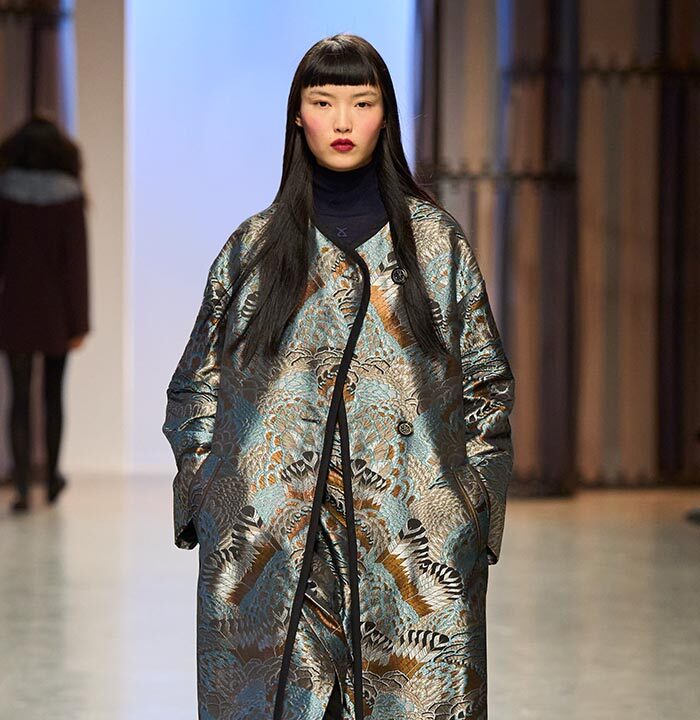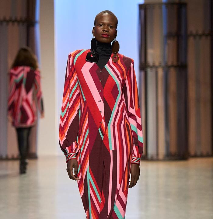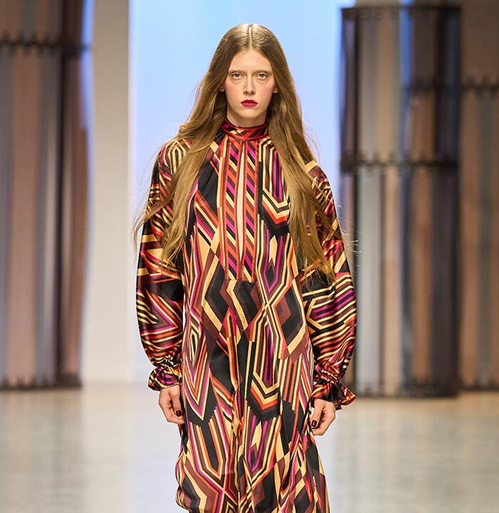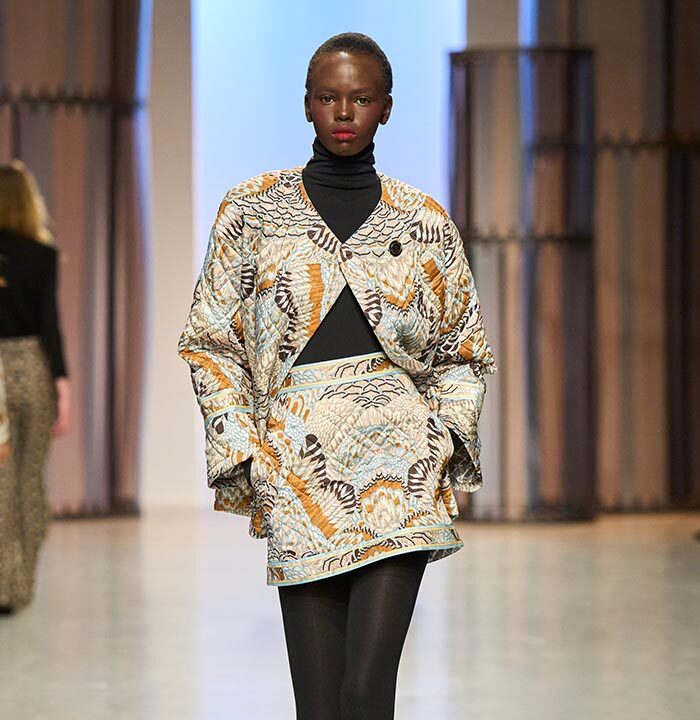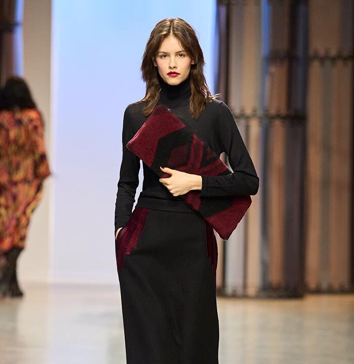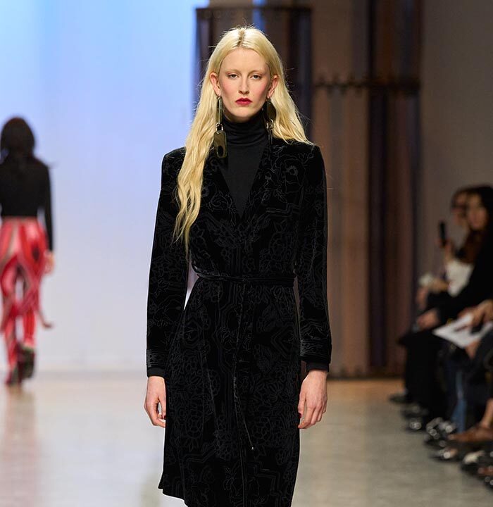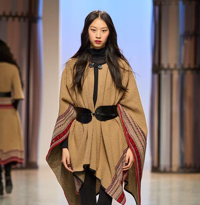 A chic beige wool dress with Peruvian stripes sets the tone for the collection. As does the coat in black wool cloth with Aztec-inspired embroidery in satin thread. It balances the psycho-Aztec prints found on a jumpsuit or on fowy evening dresses (in silk seersucker).
