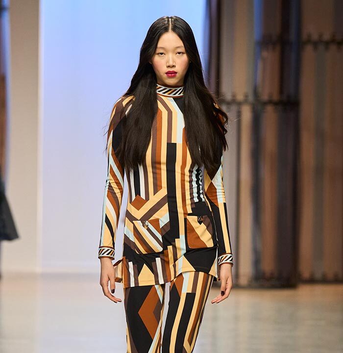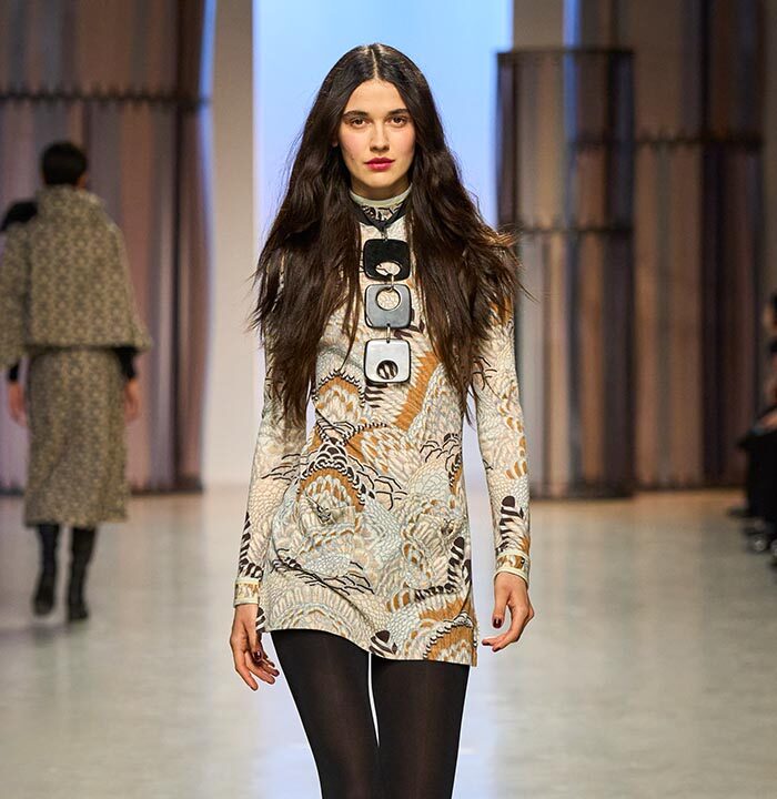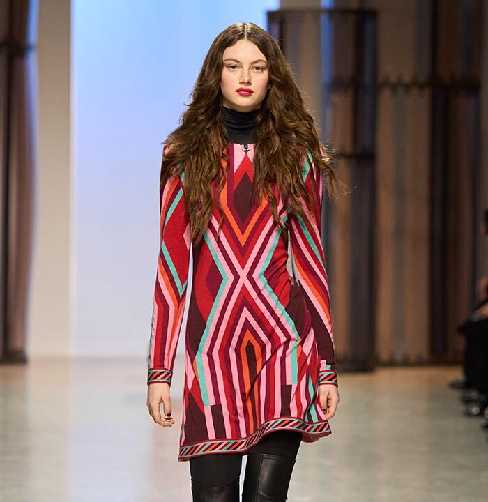 Named ‘‘Mexico’’, it features motifs from the Mayan pyramids. It is featured in the collection in a variety of colors. Also of note: the historic «JL» logo (for Jacques Leonard) is reinvented in a very Seventies spirit and worn in an all-over pattern on several models.