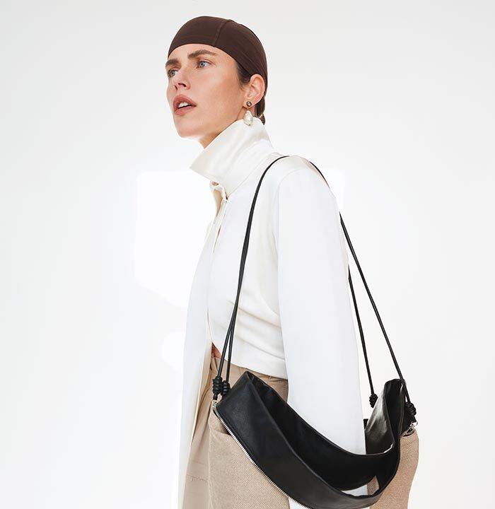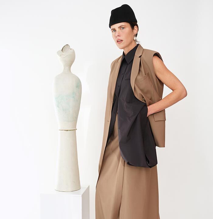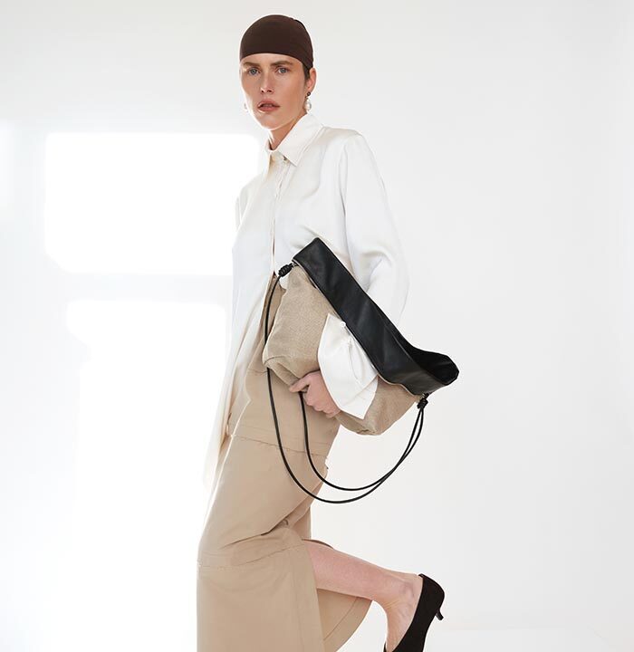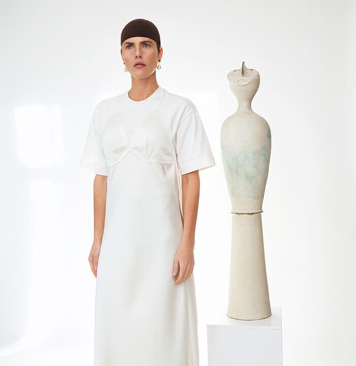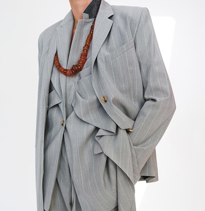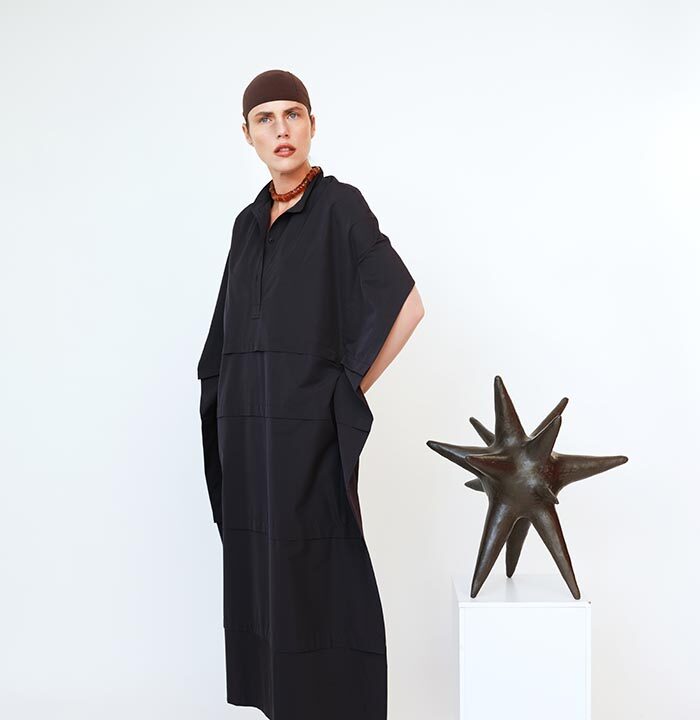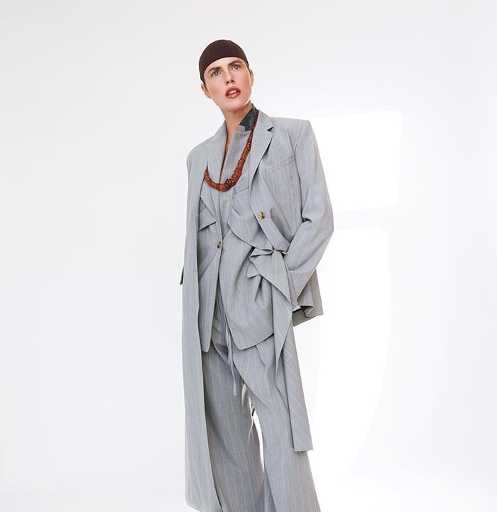 This collection continues LITKOVSKA’s exploration of architectural tailoring and responsible production, with garments crafted in the brand’s Kyiv atelier from certified natural fibers and reclaimed dead-stock fabrics.