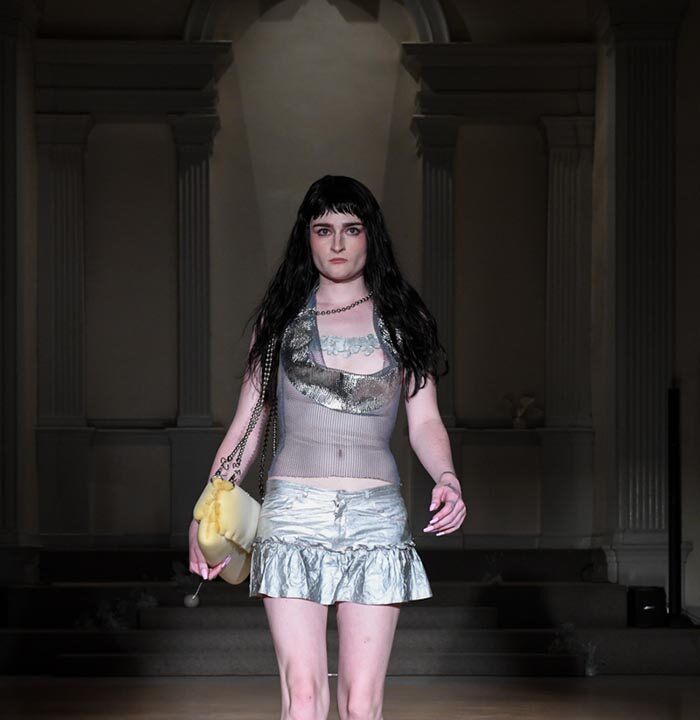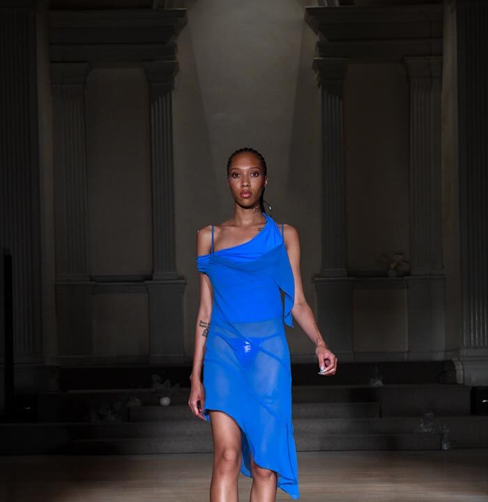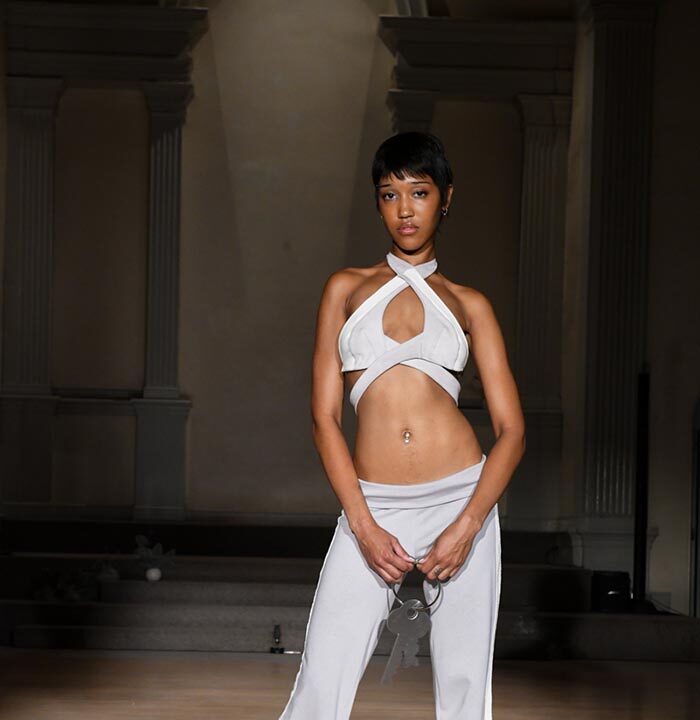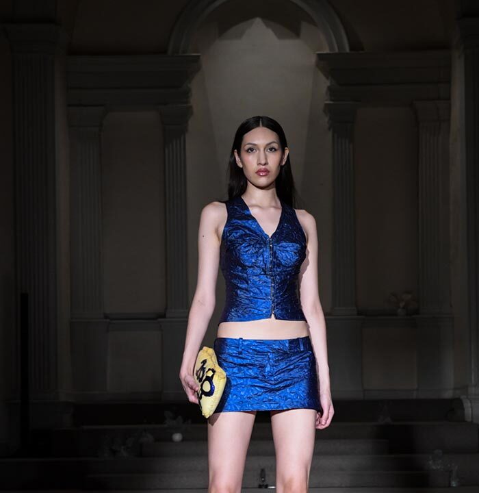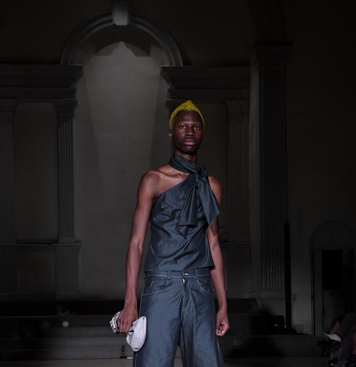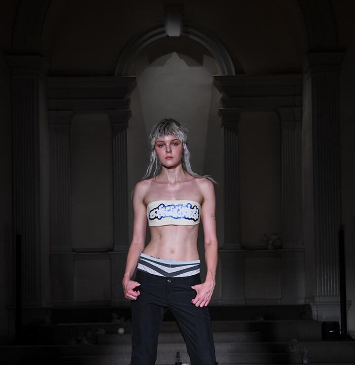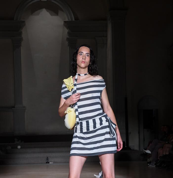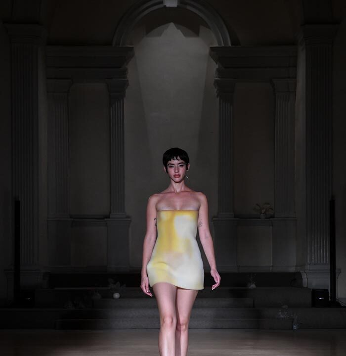 As Woodward, Gallagher, and Myers themselves evolve (see synonyms for: mature) they hedge upon the subtleties of presentation. There is a sense of refinement to the collection’s offering as the use of unconventional materials like foam, mesh, tyvek, and vinyl, transcend DIY-adjacencies and unlock the emotions we liken to certain textures, evoking nostalgia in new contexts. Momentum becomes meta through processes like the scanning of foam dresses into digital prints that are then transferred onto silk. Garments are fully-finished and intentionally tailored in silhouettes that still reflect the ha-ha joie de vivre of being potentially too provocative in “professional” settings. Woodward, Gallagher and Myers emphasize that SS24 is simply about the honest desire and drive to make, encapsulating a sense of lost purity while allowing the multiplicities of the self, versions old and new, to dance with one another. What we are left with are exploratory arrangements that tell earnest stories of personal discovery rather than make premeditated or didactic statements. We are doing this because it feels good.