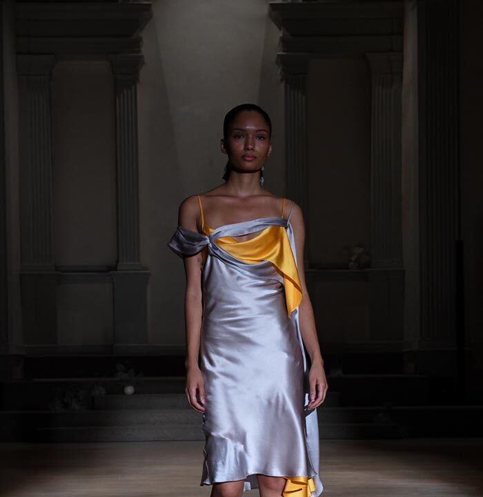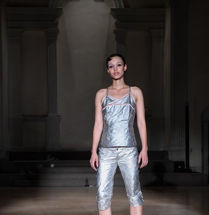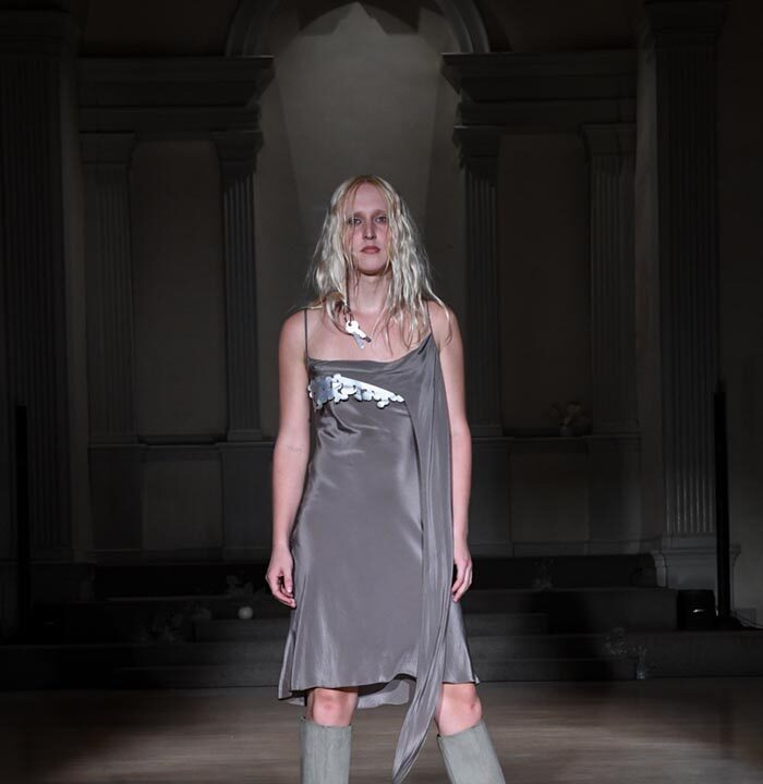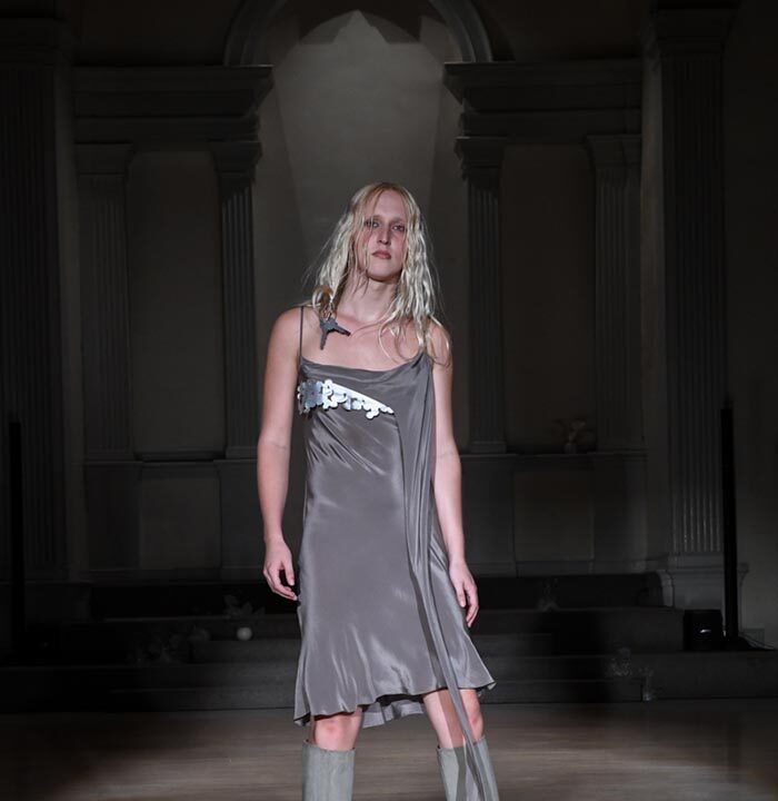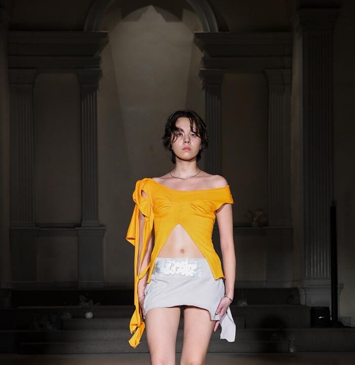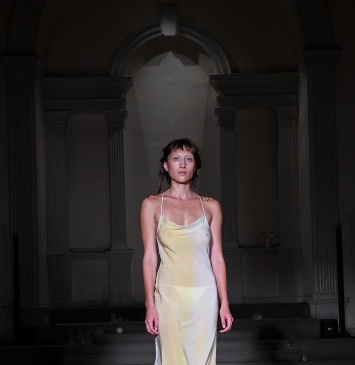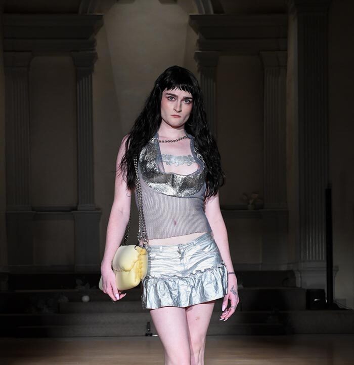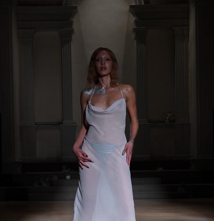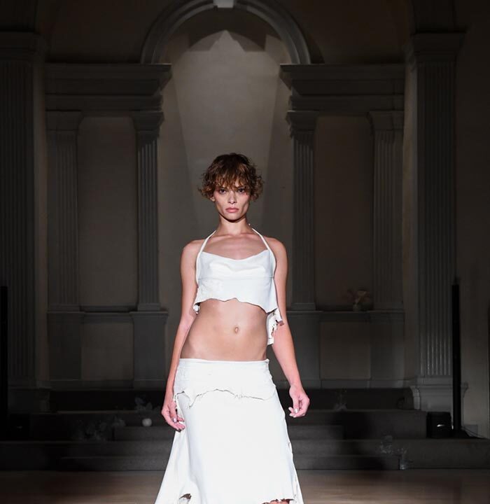 As Woodward, Gallagher, and Myers themselves evolve (see synonyms for: mature) they hedge upon the subtleties of presentation. There is a sense of refinement to the collection’s offering as the use of unconventional materials like foam, mesh, tyvek, and vinyl, transcend DIY-adjacencies and unlock the emotions we liken to certain textures, evoking nostalgia in new contexts. Momentum becomes meta through processes like the scanning of foam dresses into digital prints that are then transferred onto silk. Garments are fully-finished and intentionally tailored in silhouettes that still reflect the ha-ha joie de vivre of being potentially too provocative in “professional” settings. Woodward, Gallagher and Myers emphasize that SS24 is simply about the honest desire and drive to make, encapsulating a sense of lost purity while allowing the multiplicities of the self, versions old and new, to dance with one another. What we are left with are exploratory arrangements that tell earnest stories of personal discovery rather than make premeditated or didactic statements. We are doing this because it feels good.