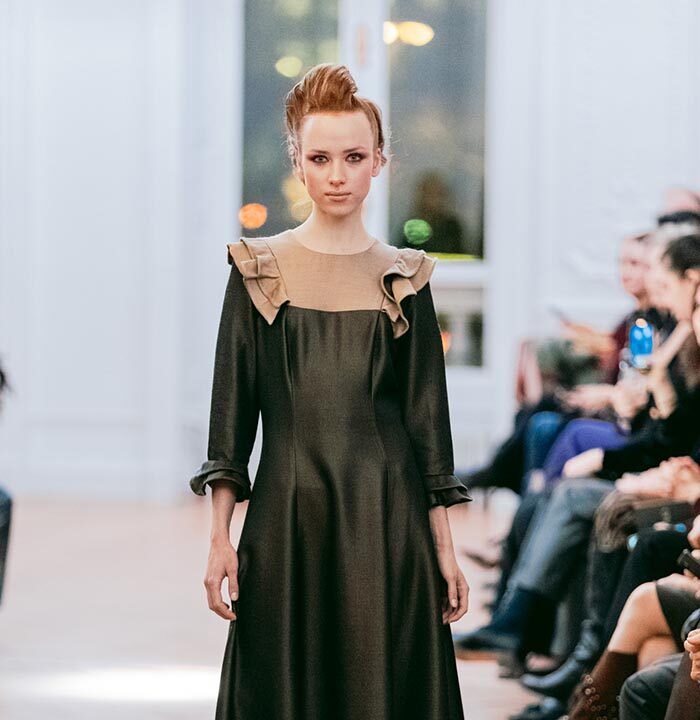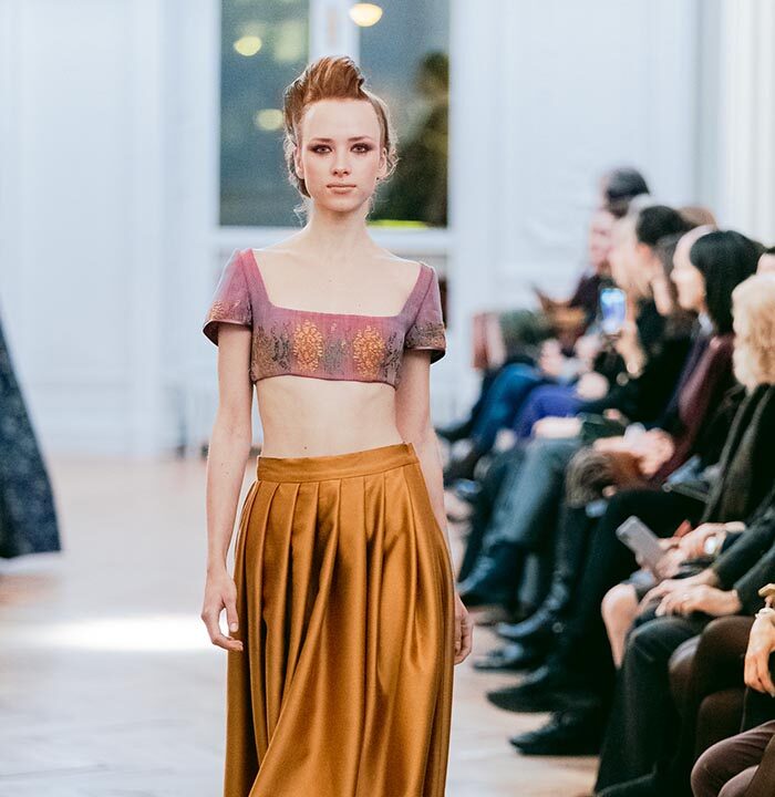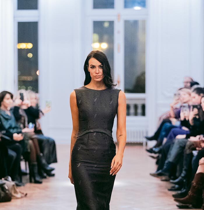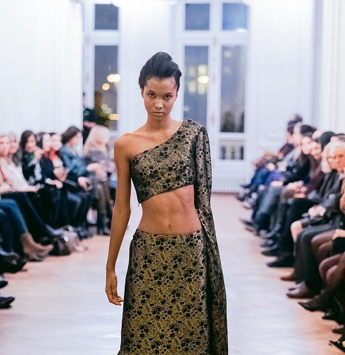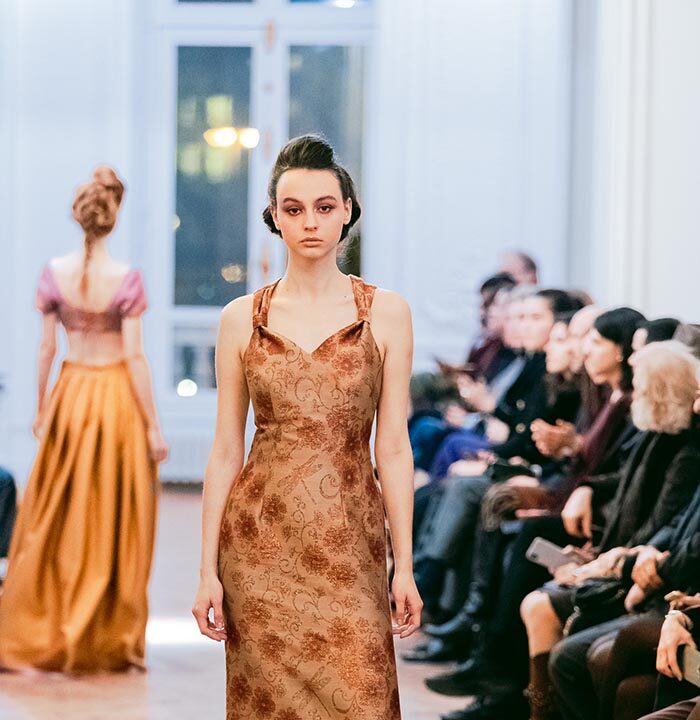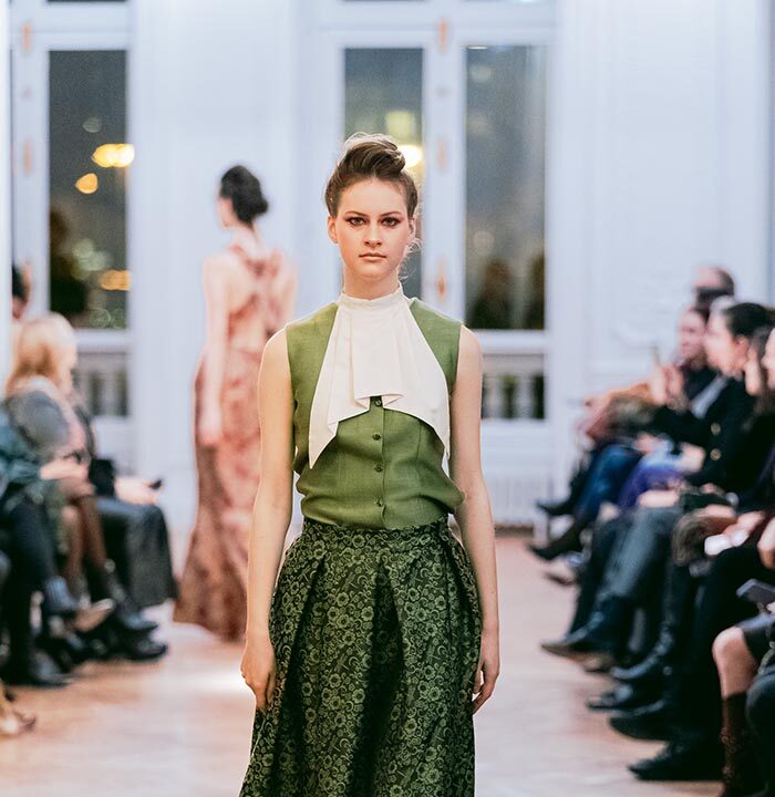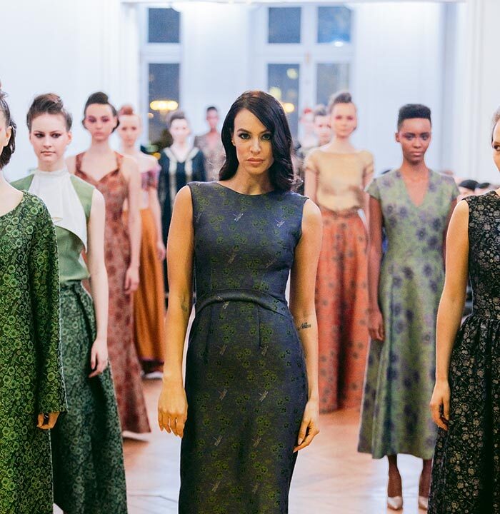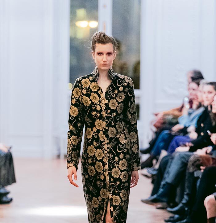 The Fashion show, introduced with the warm greeting to authorities and guests by Caterina Celestino, representative of the Maison, was attended by numerous journalists, bloggers, photographers and the specialized press. The presence of the top model Jade Lagardére honoured the Maison wearing a sinuous long evening gown with the weave dragonfly fabrics.