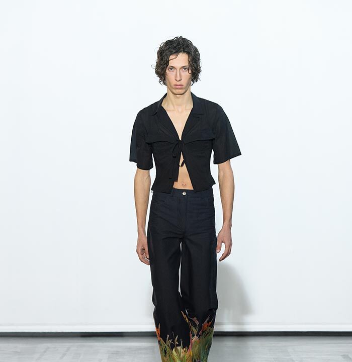 Lily petals wrap around bodies, coats mimic leaves, wildflowers grow on trousers, necklines bud, and suits tangle like stems.