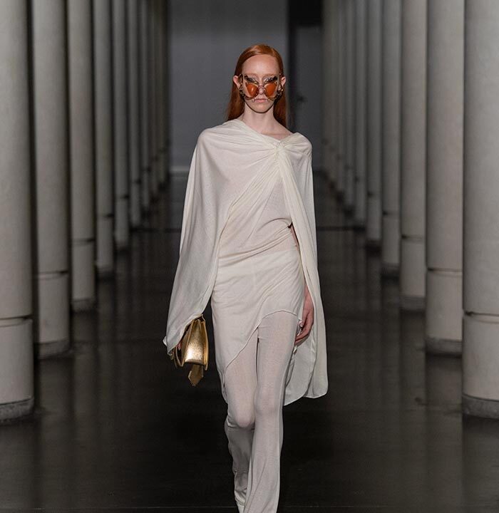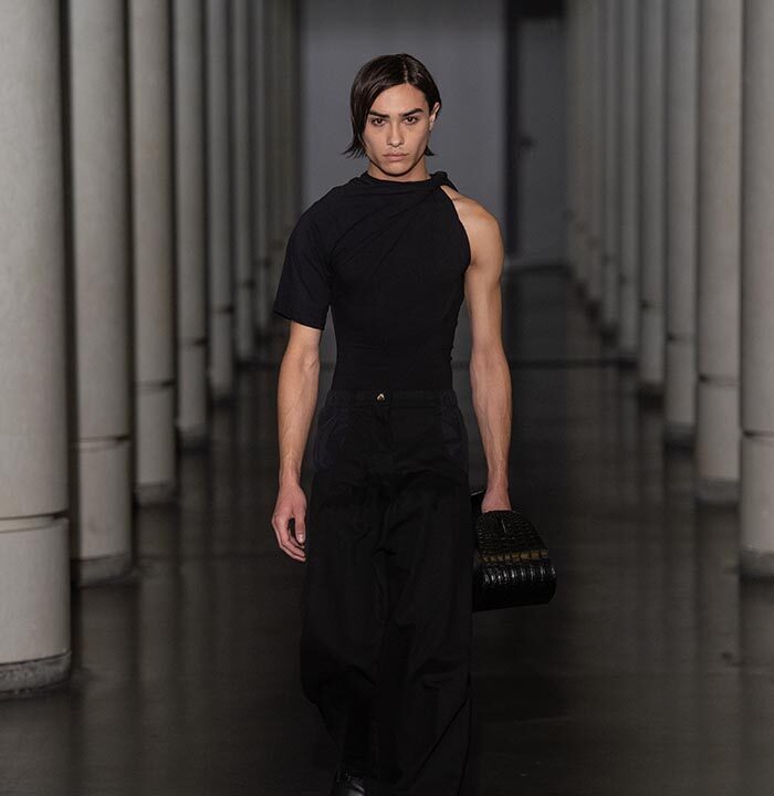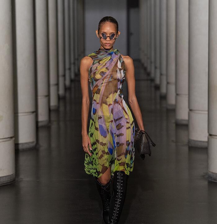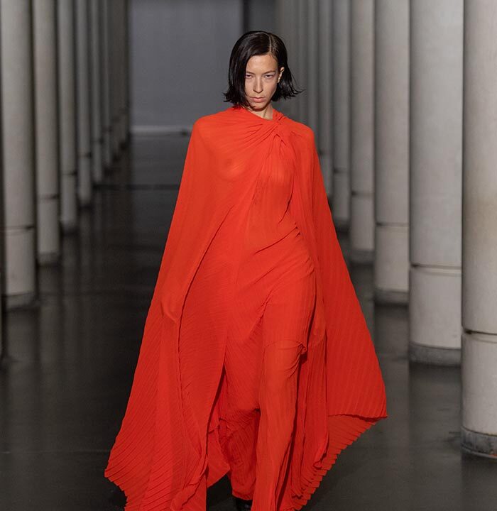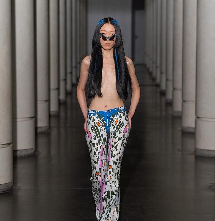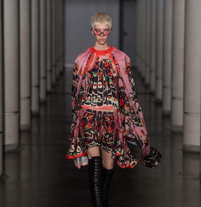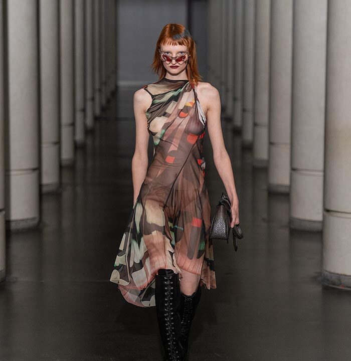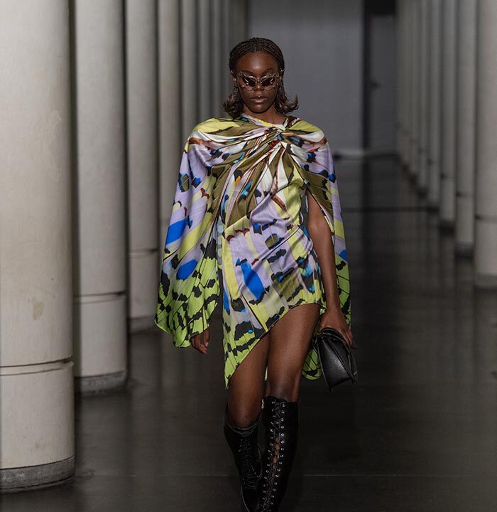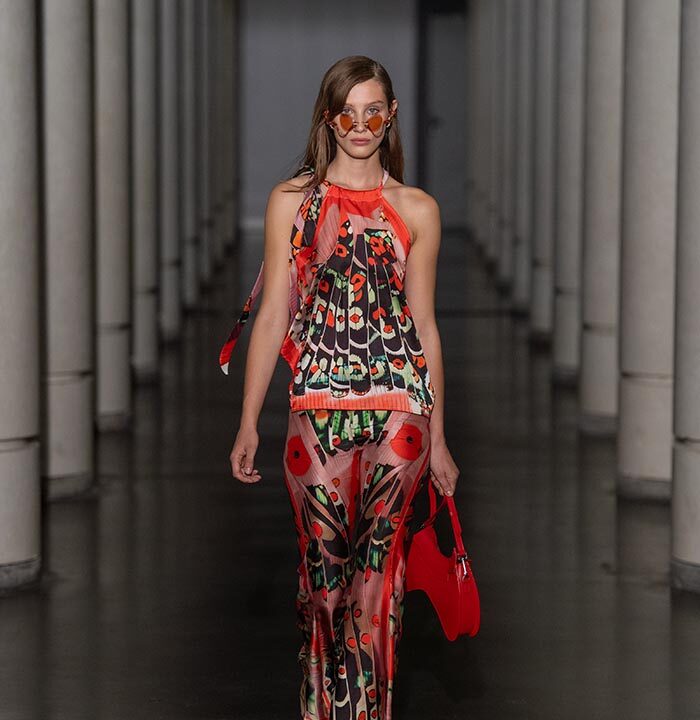 These questions and reflections inspired the Spring-Summer 2024 collection, which blends the codes of a nomadic society with relics of the past. Technical fabrics, old-fashioned pleats, sensual knots and drapes dialogue with vibrantly colored technological prints. The brand makes a point of using dead stock or recycled materials, offering a new life cycle to what others see as waste.