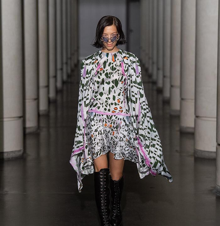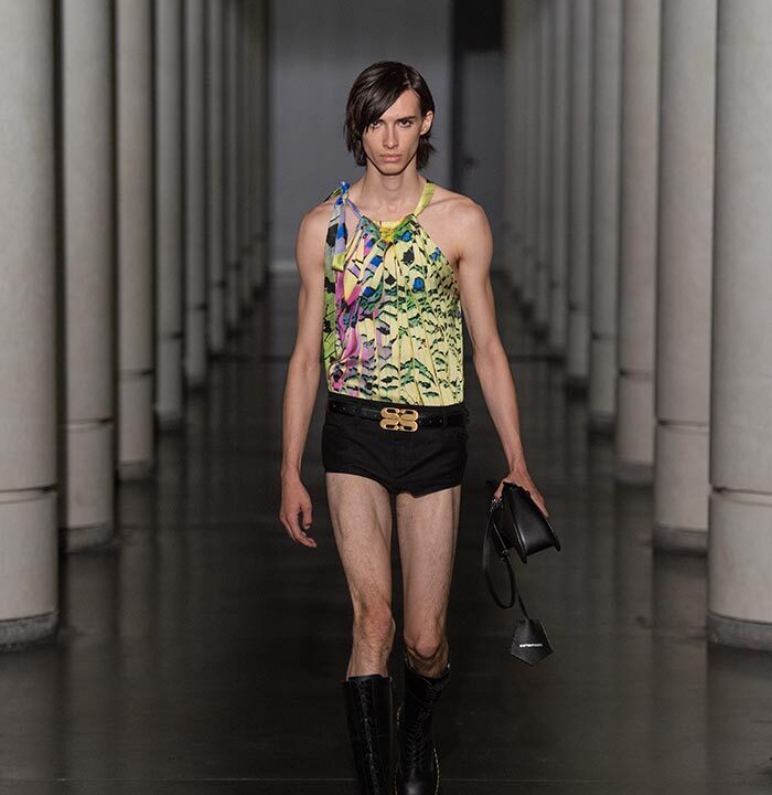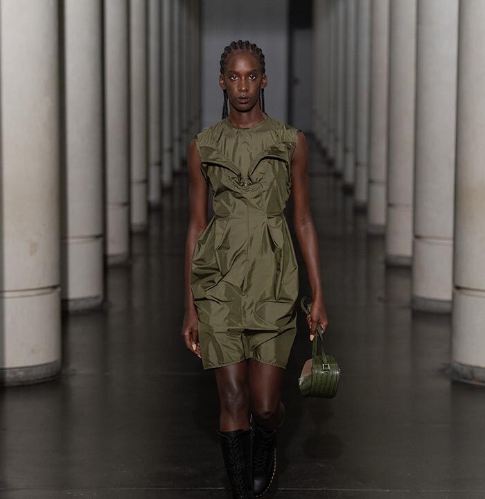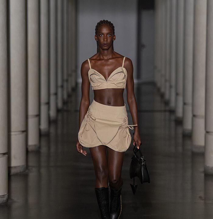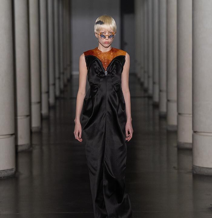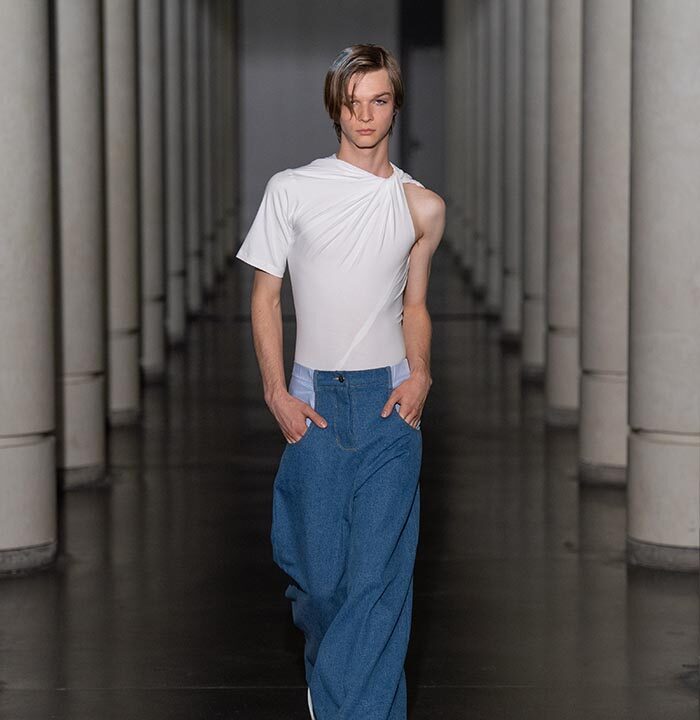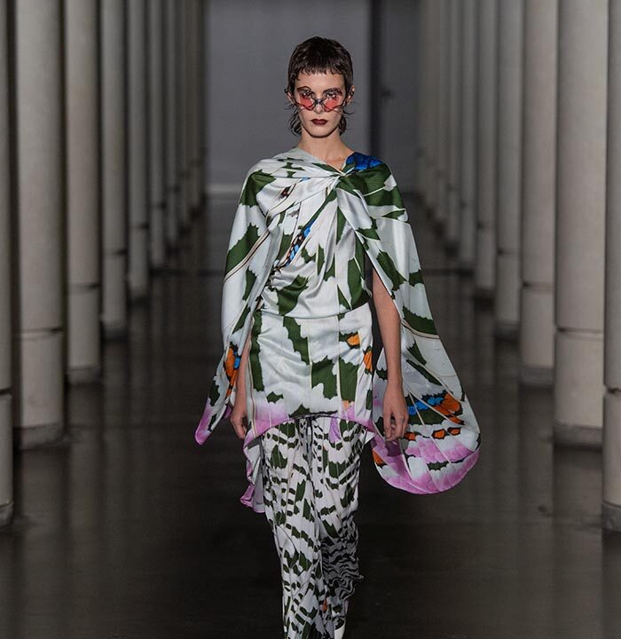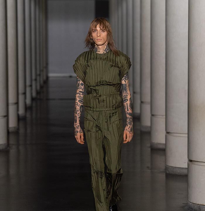 These questions and reflections inspired the Spring-Summer 2024 collection, which blends the codes of a nomadic society with relics of the past. Technical fabrics, old-fashioned pleats, sensual knots and drapes dialogue with vibrantly colored technological prints. The brand makes a point of using dead stock or recycled materials, offering a new life cycle to what others see as waste.