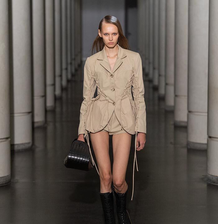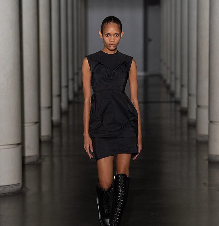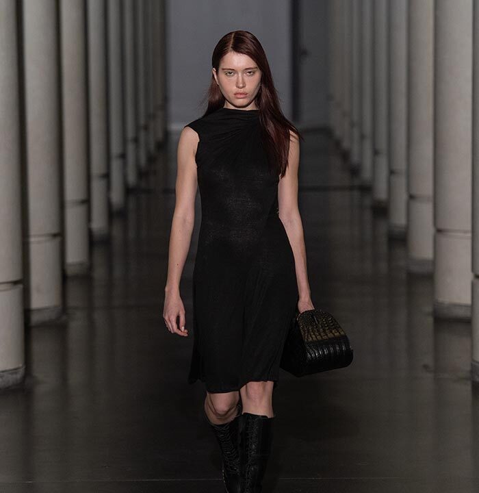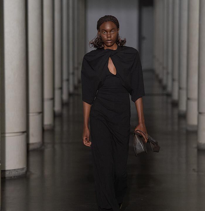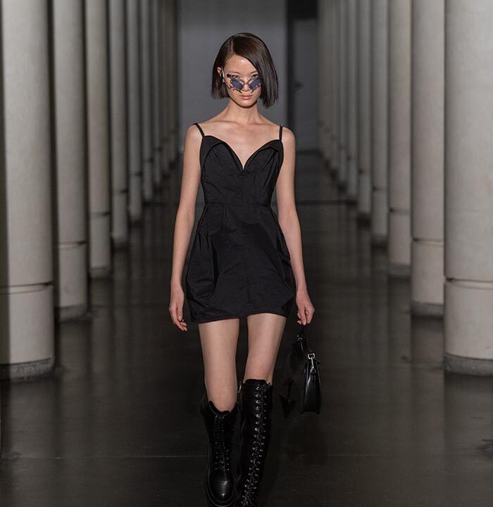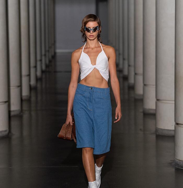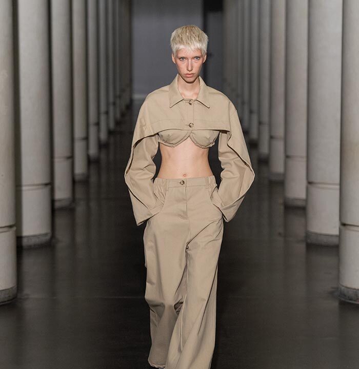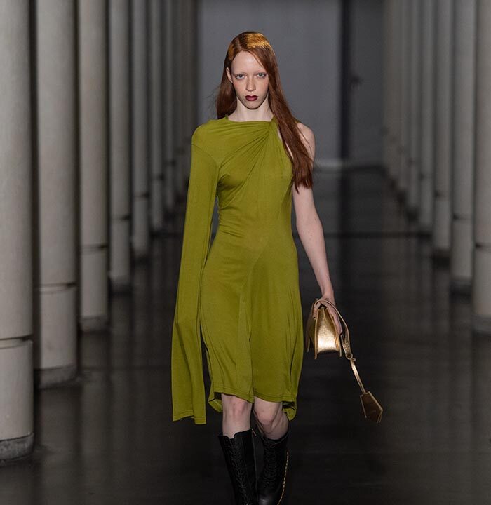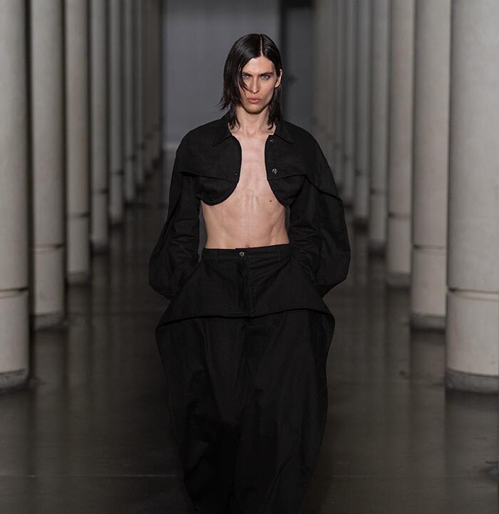 These questions and reflections inspired the Spring-Summer 2024 collection, which blends the codes of a nomadic society with relics of the past. Technical fabrics, old-fashioned pleats, sensual knots and drapes dialogue with vibrantly colored technological prints. The brand makes a point of using dead stock or recycled materials, offering a new life cycle to what others see as waste.