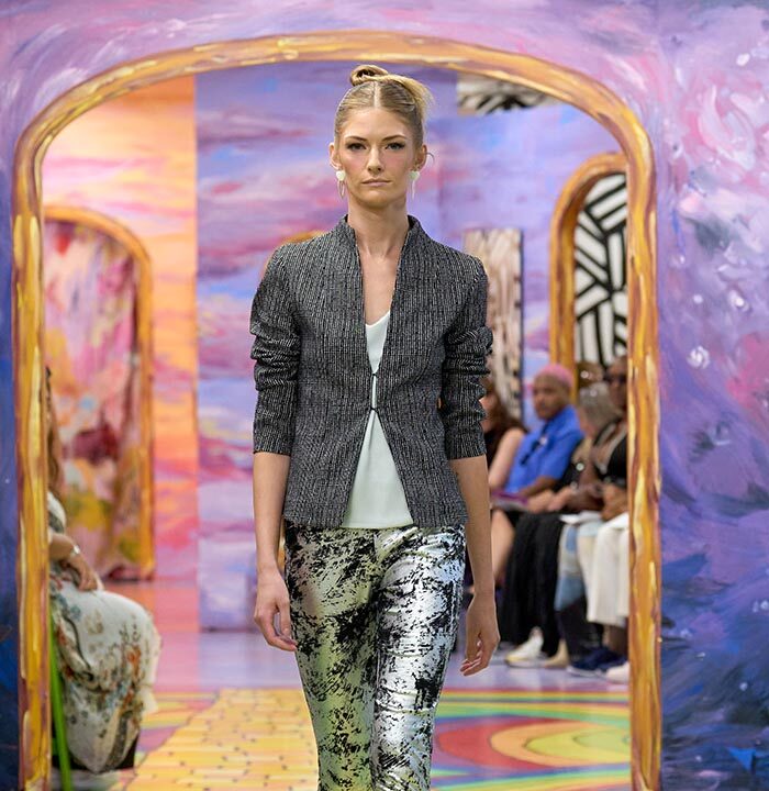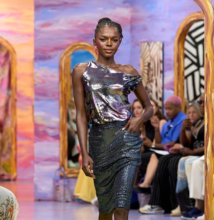 With a theme that explored the intricate dynamics of relationships, Omri’s collection enchanted the audience with a captivating blend of 70s disco glam and 80s pop, intricately crafted trompe l’oeil detailing, and a stunning array of design elements, including button as pattern detailing, color blocking, metallic print florals, “halfsies” dresses, and shimmering sequins.