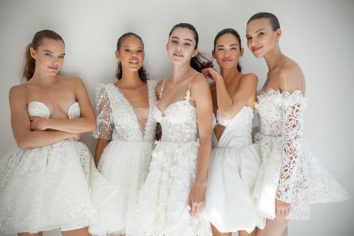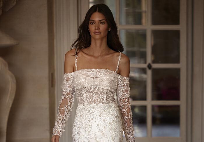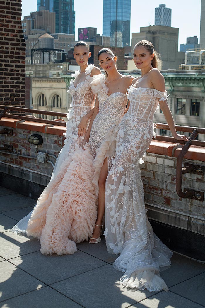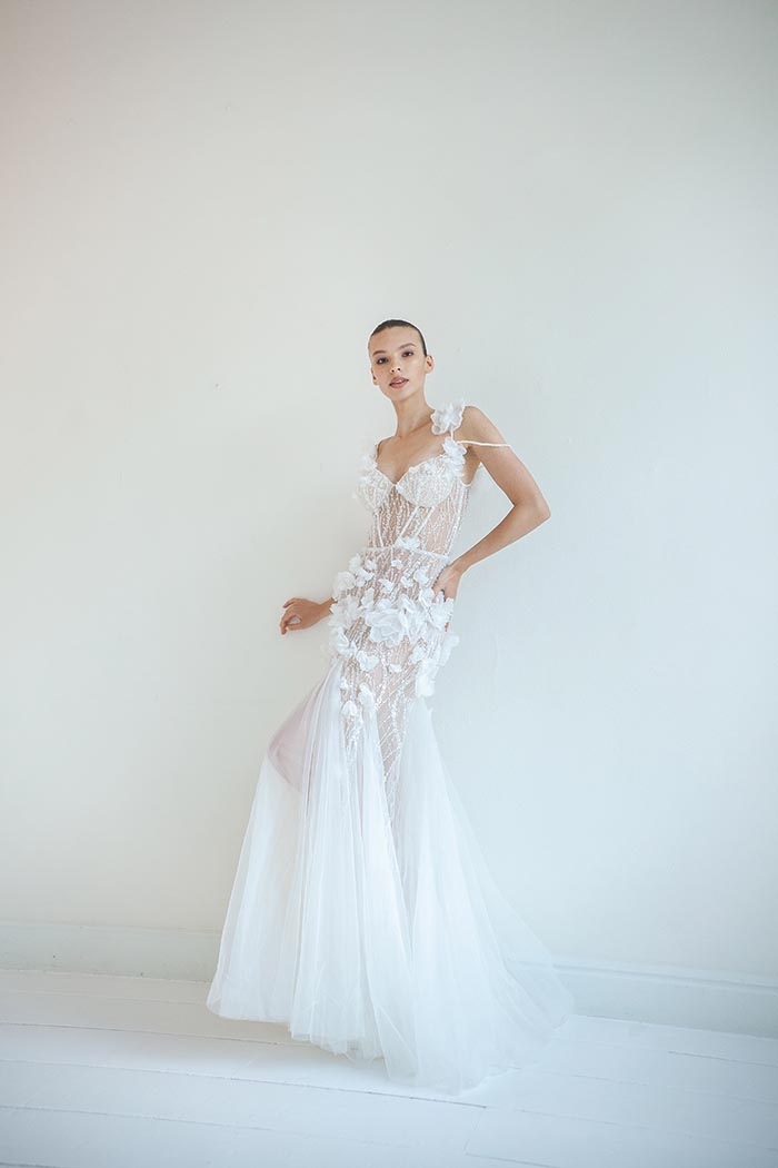 The collection inherits couture influences combining the finest detailing and craftsmanship. It is filled with handcrafted pearls, beadings, sequin embellishments, and volumetric lace appliques. This line became recognizable for its signature touches: semi-transparent lace, lush ornaments, and tight-fitted trumped and mermaid-style silhouettes.