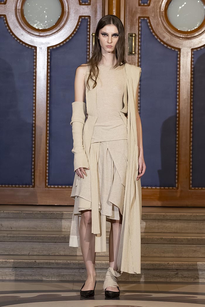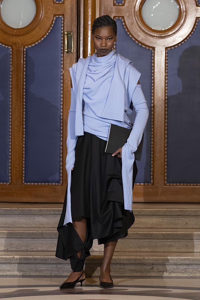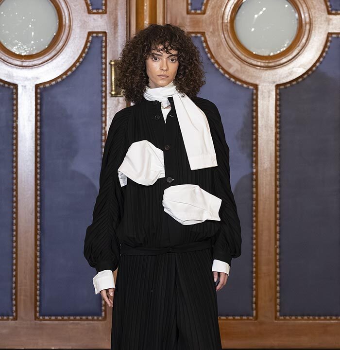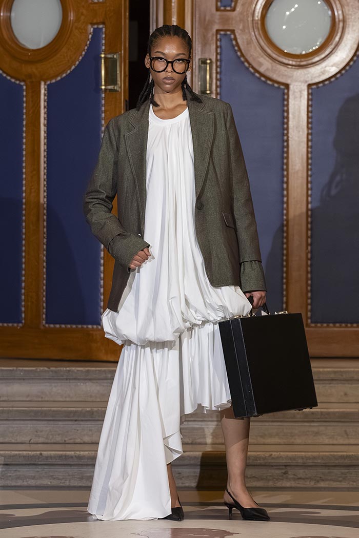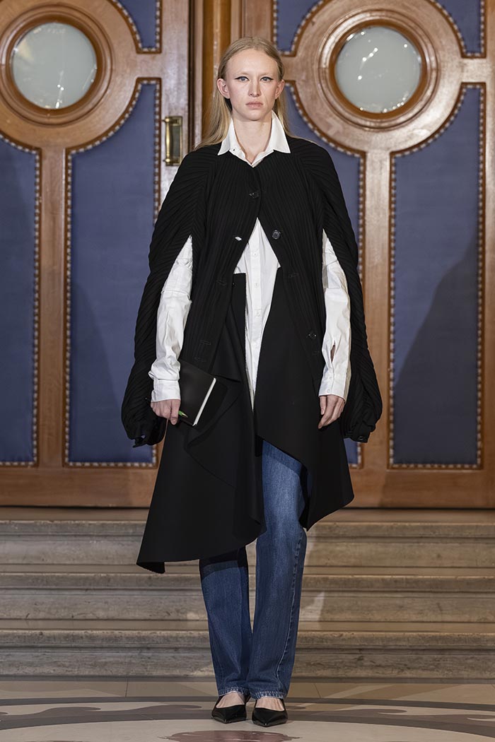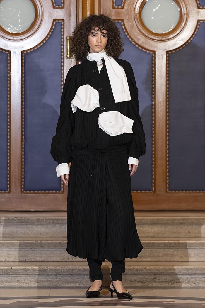 The collection draws directly from the wardrobe of the judiciary, including judges’ robes and the silhouettes of lawyers and prosecutors, reinterpreted through MOSSI’s lens. Structured volumes dialogue with the house’s signature pleating, while certain sculptural forms evoke the work of South Korean artist Lee Bul.