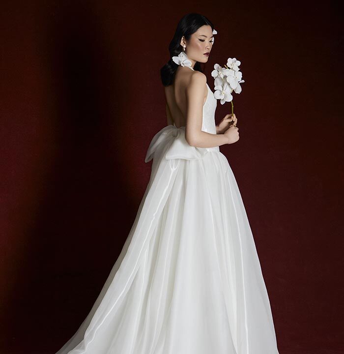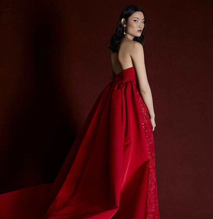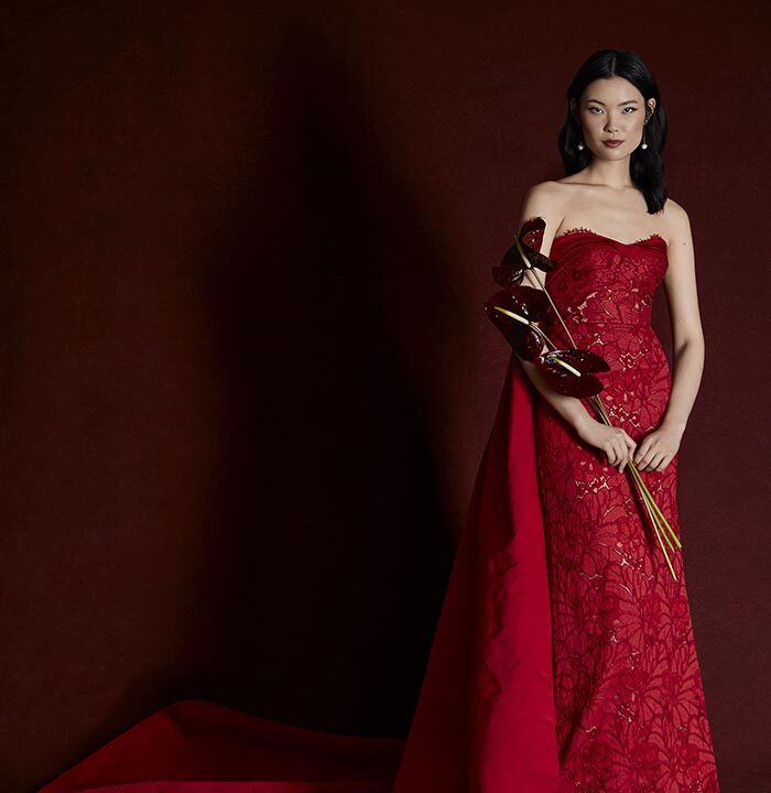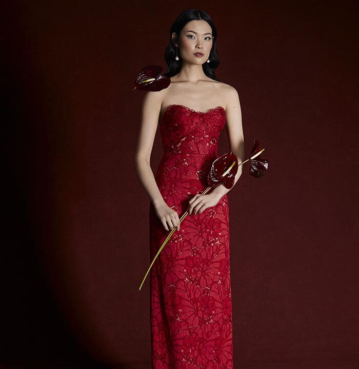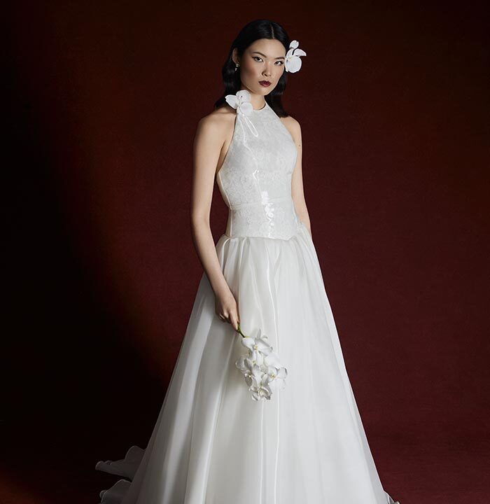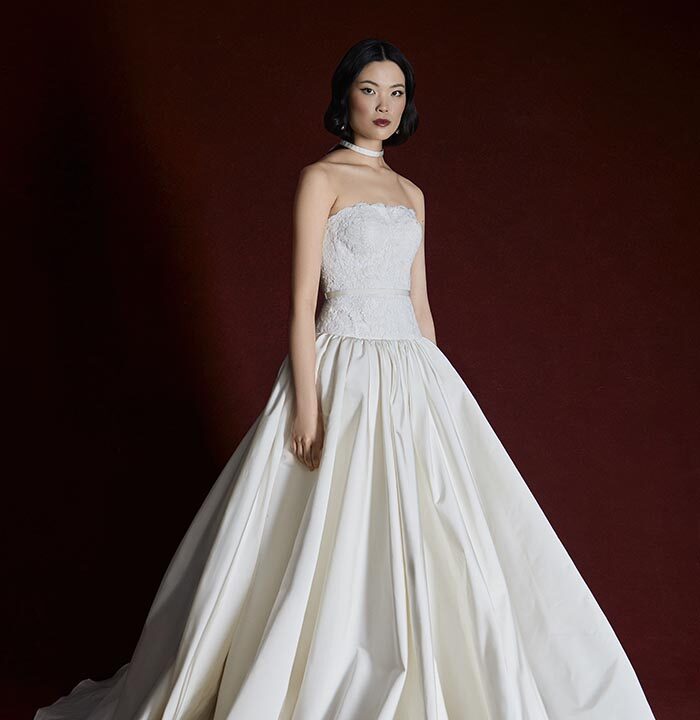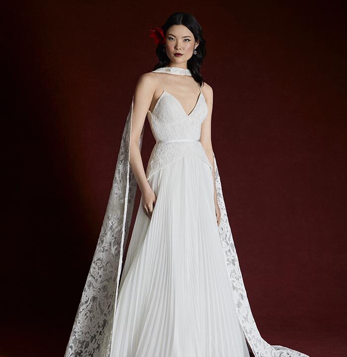Italian silk faille, corded lace, and lightweight chiffons return, joined by new textures like macramé, silk charmeuse, and sunburst-pleated fabrics. These materials become the foundation for refined silhouettes that highlight movement, form, and construction — from sculpted bustiers to full ball skirts and delicately hand-draped bodices.