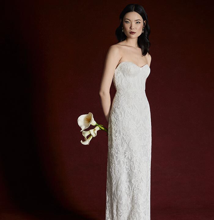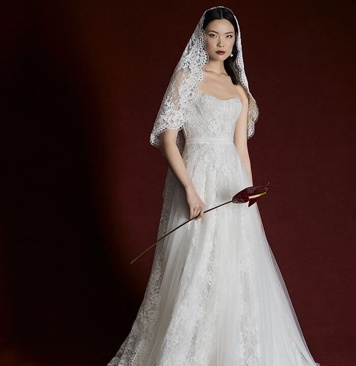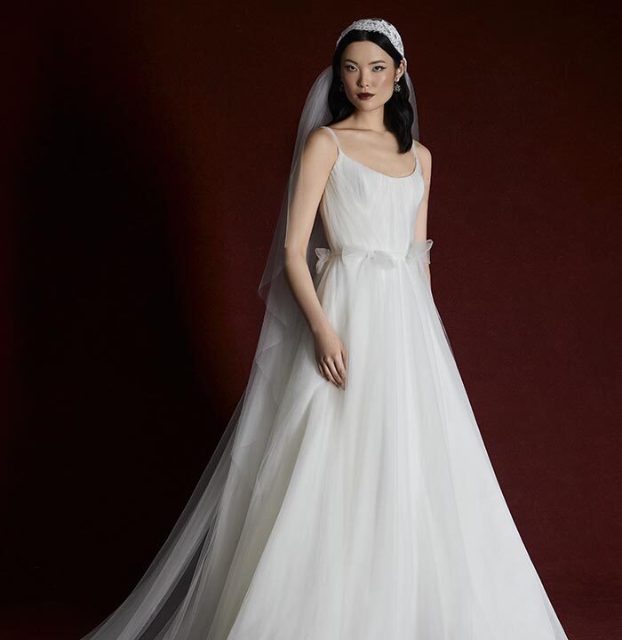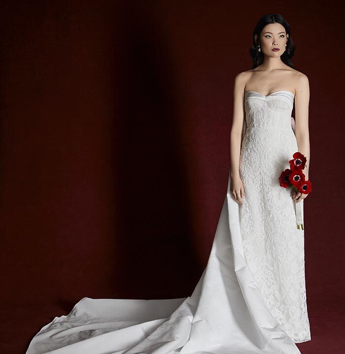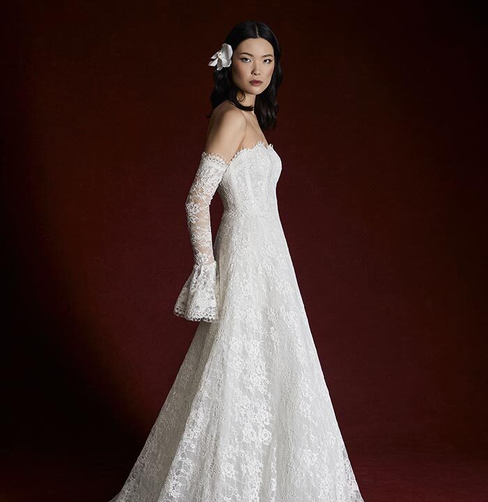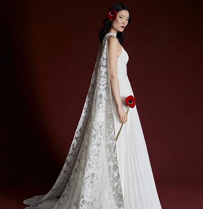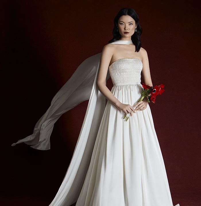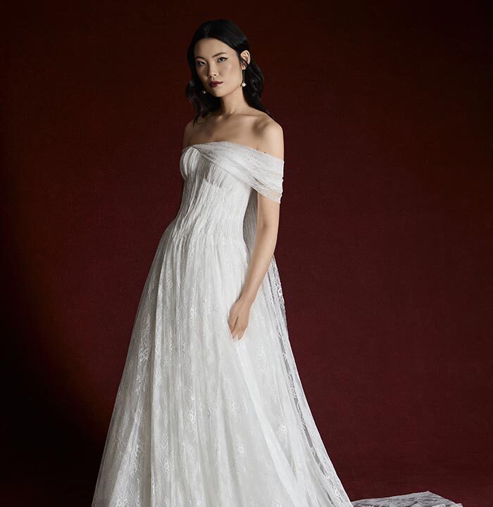 Italian silk faille, corded lace, and lightweight chiffons return, joined by new textures like macramé, silk charmeuse, and sunburst-pleated fabrics. These materials become the foundation for refined silhouettes that highlight movement, form, and construction — from sculpted bustiers to full ball skirts and delicately hand-draped bodices.