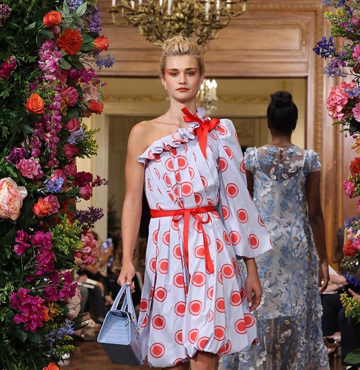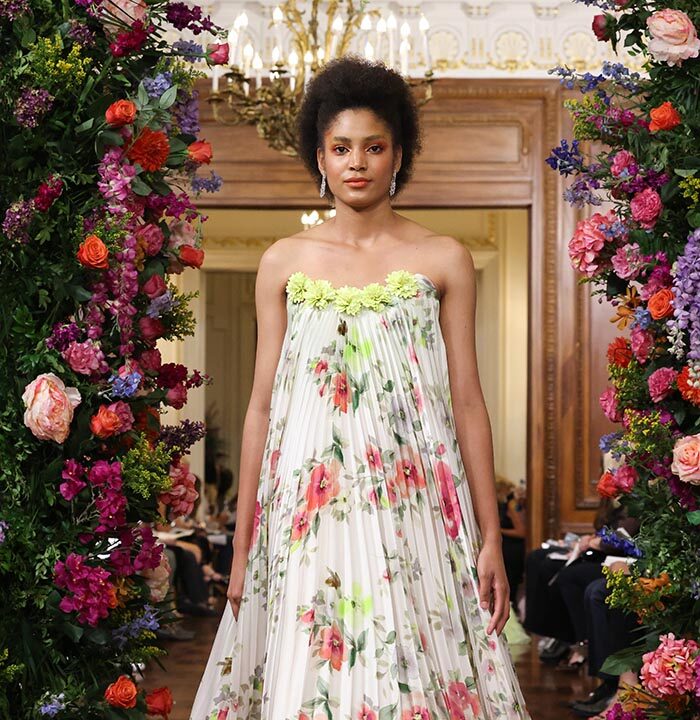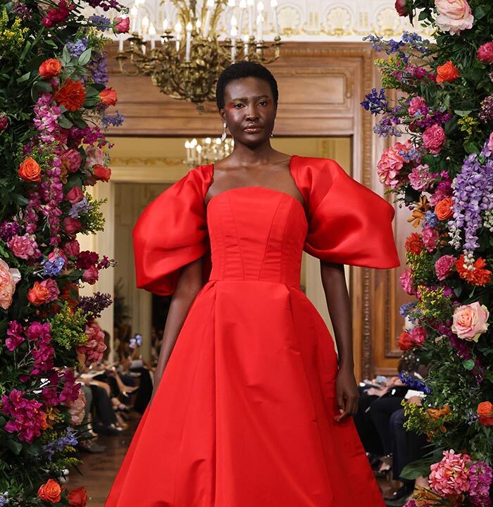 LOOK 55 Scarlet Allure: A Strapless Silk Faille Ball Gown in Lipstick Red LOOK 56 Whimsical Dreamscape: A White/Multi-Colored Strapless Pleated Viscose