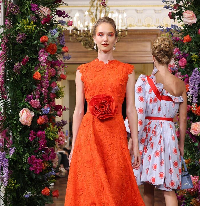 LOOK 5 Passion in Lace: A Vivid Tea Length Dress in Bright Red, Crafted from Exquisite French Lace, Enhanced with a Satin Faced Organza Rosette Belt