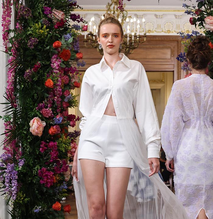 LOOK 7 Modern Classic Fusion: A Chic White Button-Down Shirt Dress Meets Dramatic Elegance with a Tulle Skirt Overlay, Paired with a Corset and Shorts Ensemble