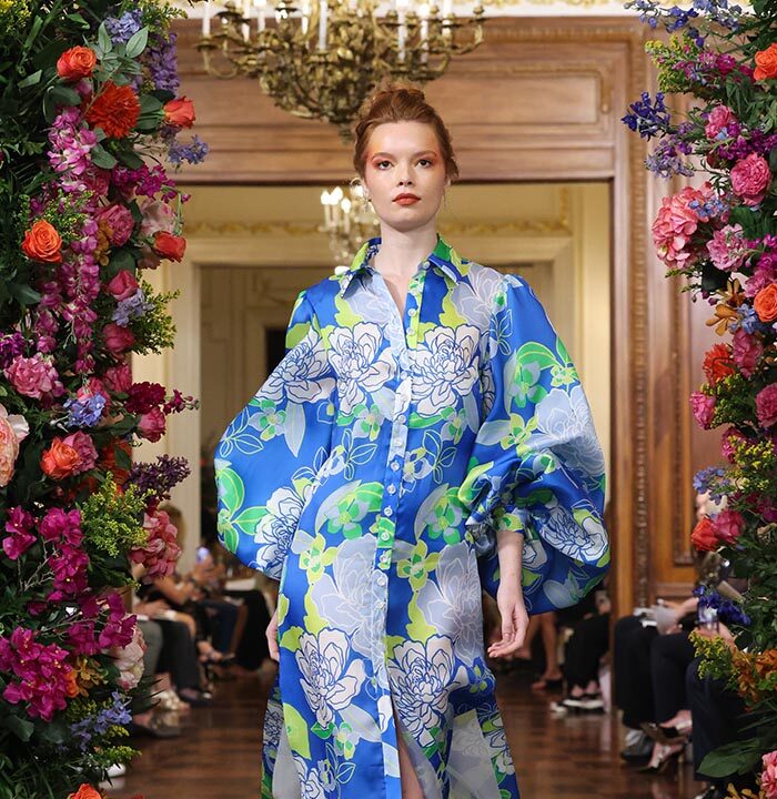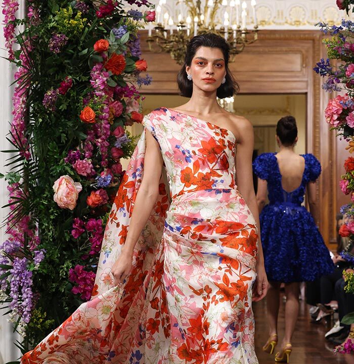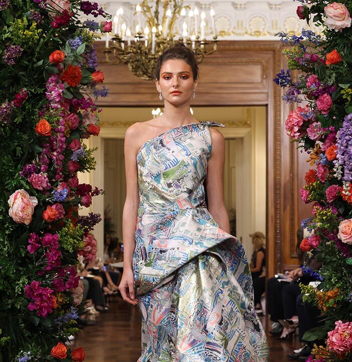 Step into a realm of exquisite beauty where the charm of Venetian glass meets the splendor of blossoming flora. Our runway collection intertwines the intricate elegance of Venetian craftsmanship with the vibrant allure of botanical blooms. Explore the depth of 3D textures and the interplay of architectural elements, creating a dramatic symphony of colors and forms.