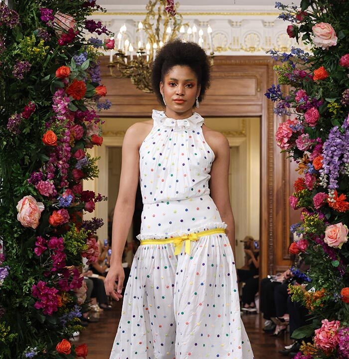 LOOK 11 Elegant Chic: High Neck Multicolor Polka Dot Dress Crafted from Shirting, Adorned with Grosgrain Ribbon Accents