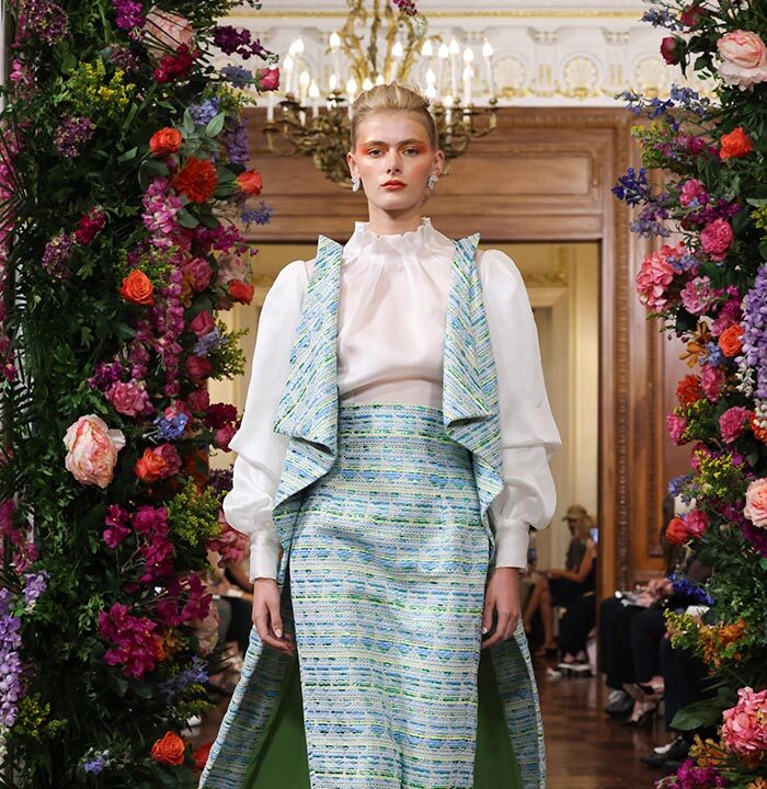 LOOK 13 Chic Sophistication: A White Organza Tailored Blouse Paired with a Matching Metallic Tweed Pencil Skirt and Duster for Effortless Elegance