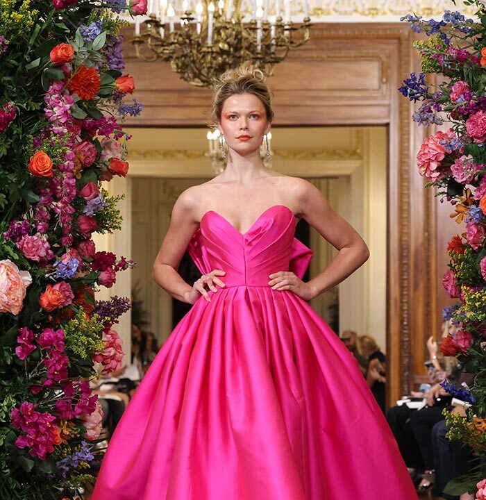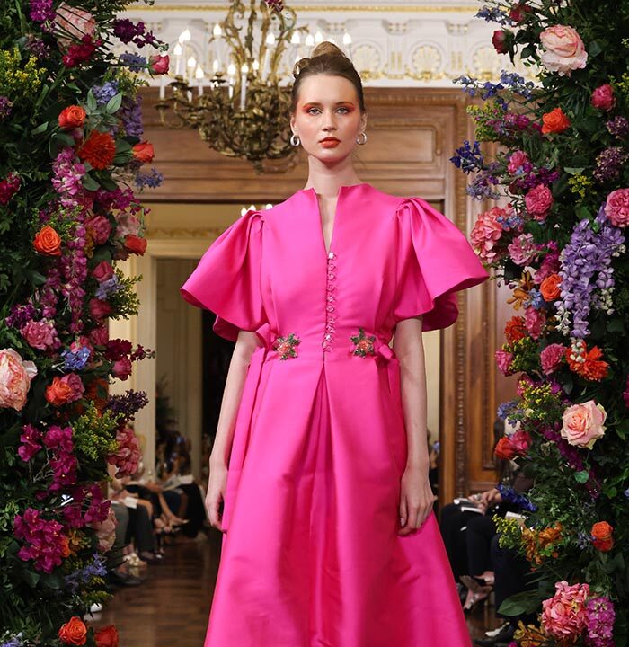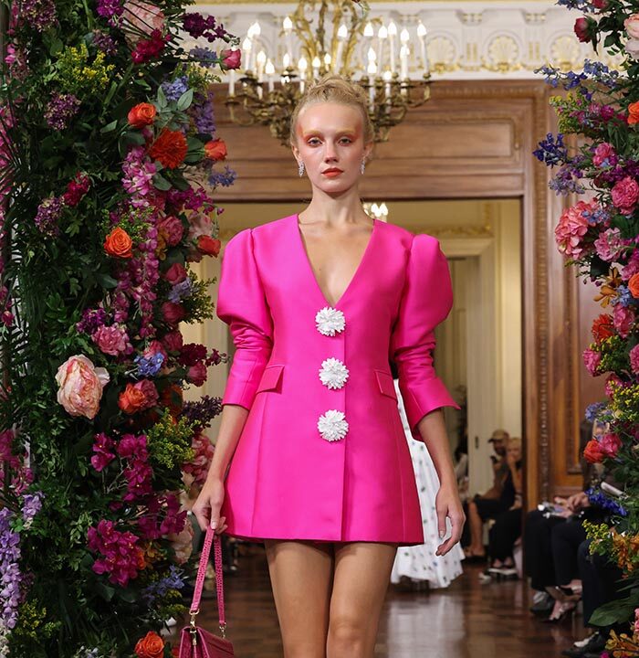 LOOK 16 Blossoming Boldness: A Hot Pink Silk Mikado Long Sleeve Blazer Dress with Flower Button Detail