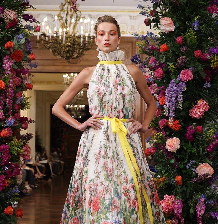 LOOK 20 Sunrise Elegance: A White/Multi Silk Organza Print Dress with Subtle Pleats, Featuring a High Neck Satin Face Organza Overlay in a Pleated Floral Print