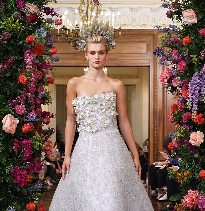 LOOK 21 Sculpted in Silver: A Dazzling Strapless Crystal-Beaded Fringe Ballgown Adorned with Exquisite 3D Floral Appliqué