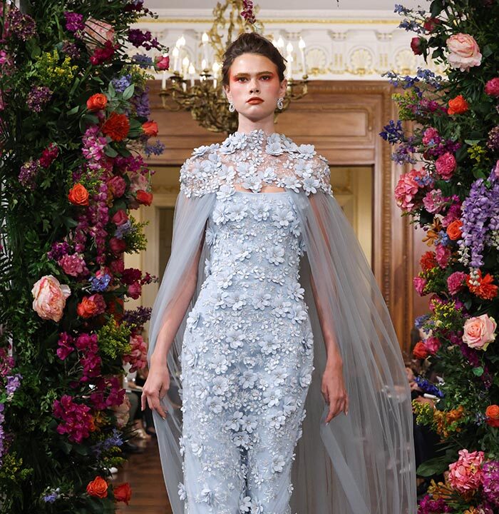 LOOK 47 Whimsical in Baby Blue: A Strapless Fully Beaded 3D Floral Embroidered Gown, Enchanted by an Embroidered Tulle Cape