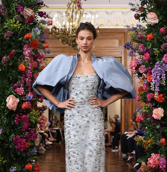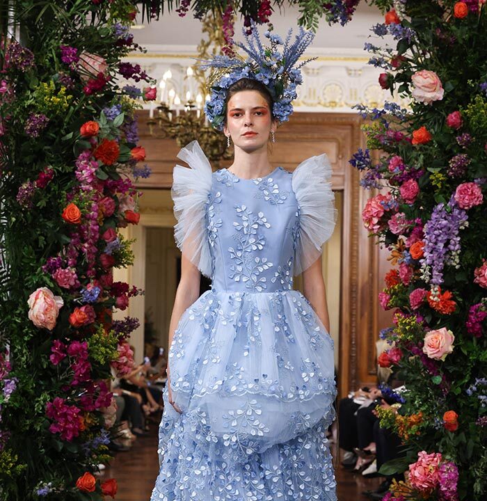 LOOK 45 Blooms of Elegance: A Hydrangea Blue Dress Adorned with Exquisite Hydrangea Floral Embroidery, Complemented by a Tulle Shawl