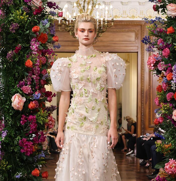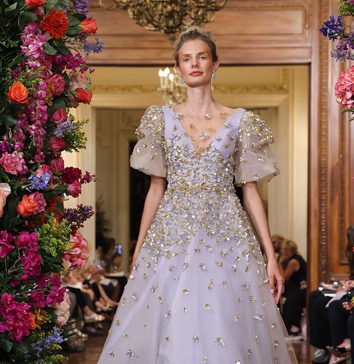 LOOK 61 Lavender & Green Dream: A High-Neck, Fully Embroidered Starburst Gown with Puff Sleeves and Delicate Floral Appliqué