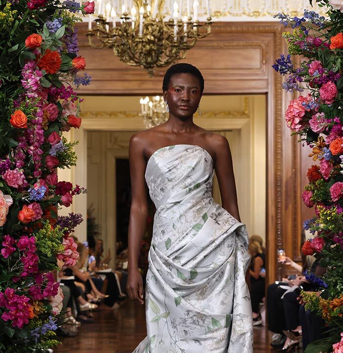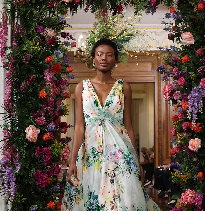 LOOK 41 Blossoms of Elegance: A Satin Faced Organza Floral Print Gown with Draped Rosette and Embroidered Florals at the Waist