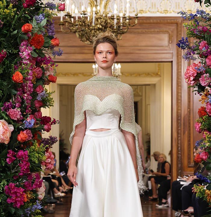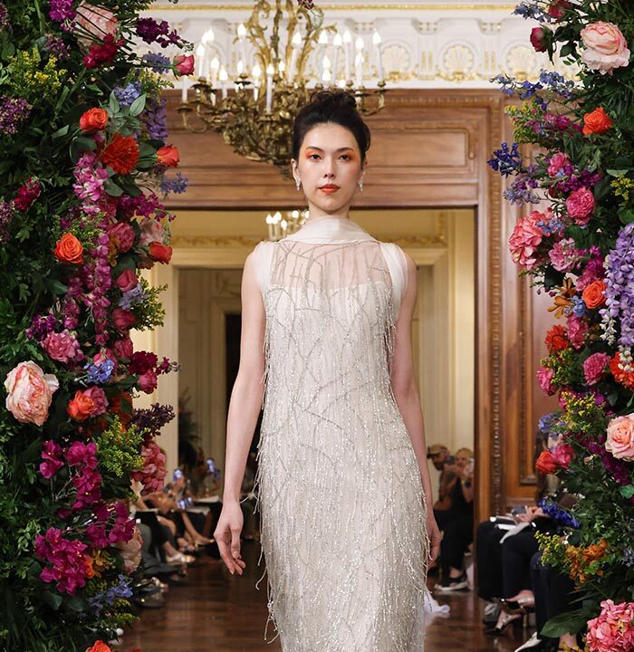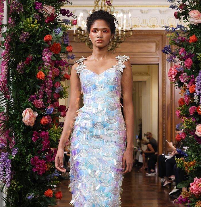 LOOK 31 Stained Glass Reverie: A Vincentian Glass-Inspired Gown featuring Sweetheart Iridescent Fringe, Exquisite Floral Embroidery, and Sterling Silver Floral Accents