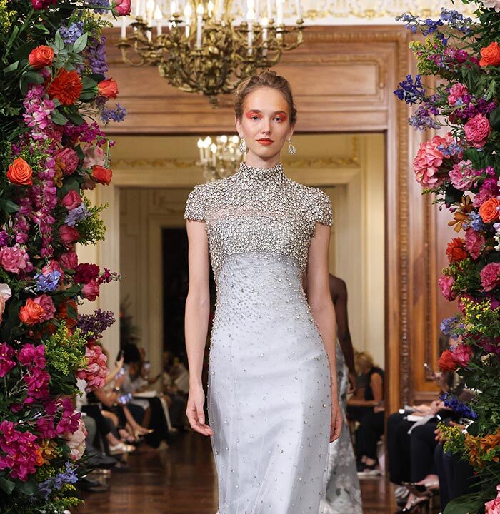 LOOK 28 Celestial Elegance: A High Neck Column Gown Adorned with Moonstone Sparkle Embroidery and Fully Beaded Glamour