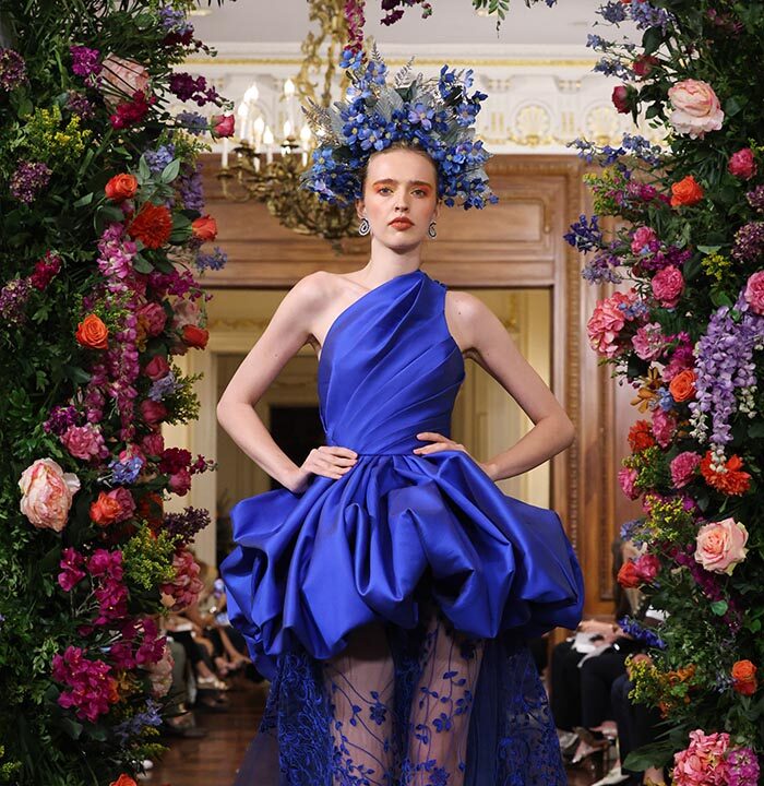 LOOK 34 Blue Elegance Unveiled: A Striking One Shoulder Peplum Gown with a Sheer Floral Embroidery Skirt Crafted from Luxurious Silk Mikado