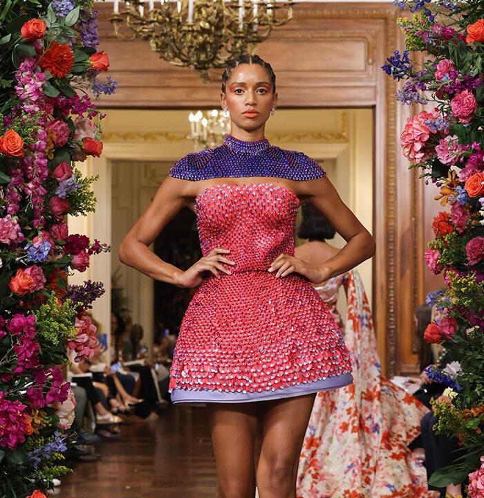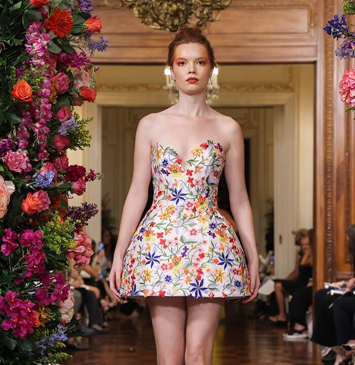 LOOK 40 Blooms of Elegance: A Multicolor Floral Embroidered Sweetheart Neckline Mini Dress Crafted from Luxurious Silk Mikado, with a Playful Bubble Skirt