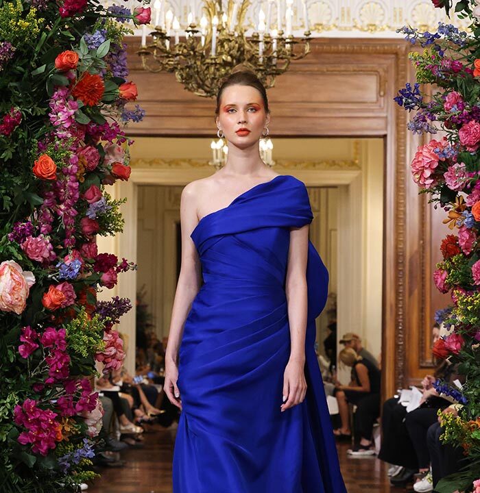 LOOK 36 Redefining Elegance: Cobalt Blue One-Shoulder Draped Silk Gazar Gown with a Full Skirt
