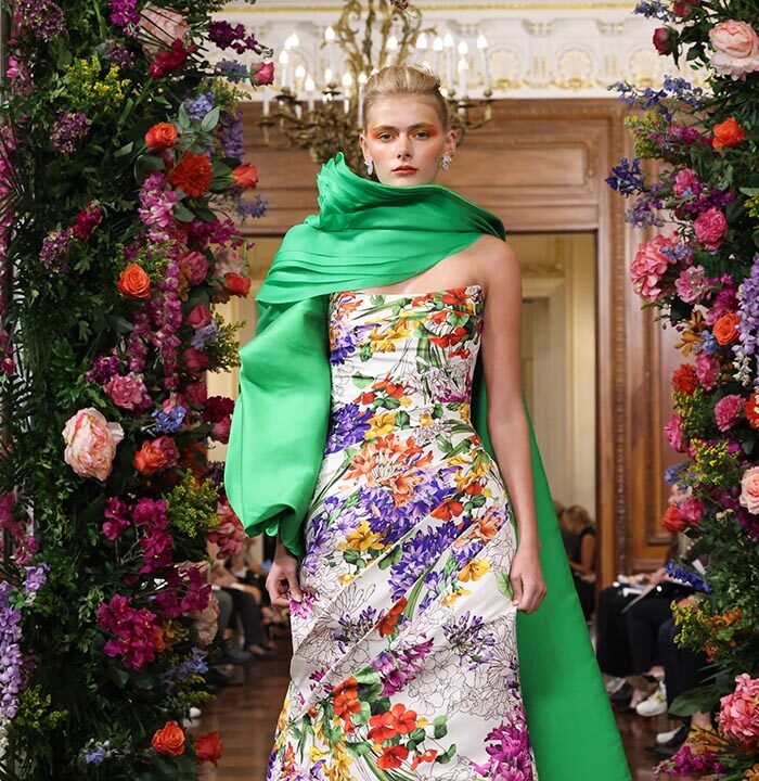 LOOK 37 Blossoming Beauty: A Strapless Draped Gown in Spring Floral Print Silk, Enhanced by a Puff Sleeve Jacket and Layers of Ethereal Organza