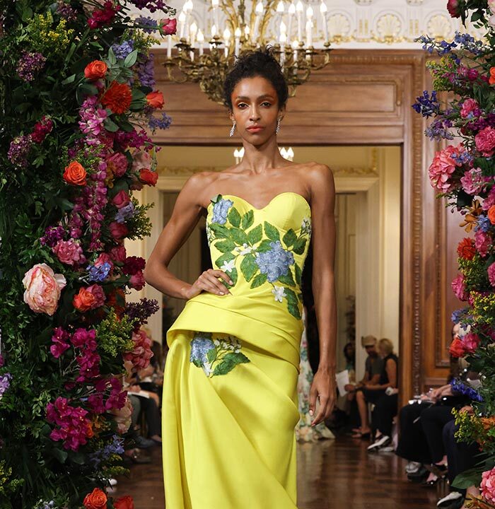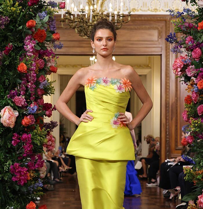 LOOK 46 Sun-Kissed Elegance: A Buttercup-Colored Strapless Paris Mikado Peplum Gown Adorned with Exquisite Glass 3D Floral Appliqué