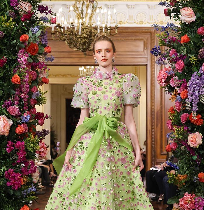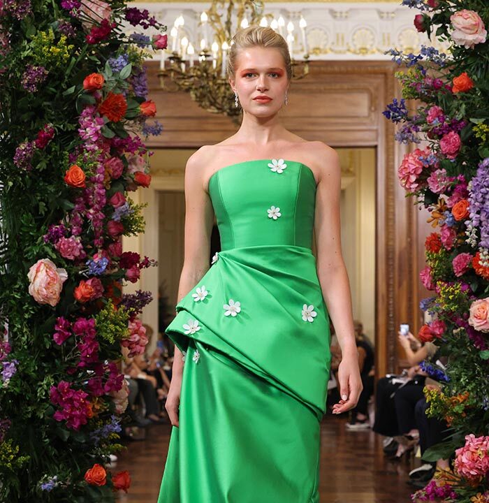 LOOK 39 Emerald Dreams: A Vibrant Green Silk Mikado Gown Adorned with Hand-Placed Draping and Exquisite Floral Embroidery