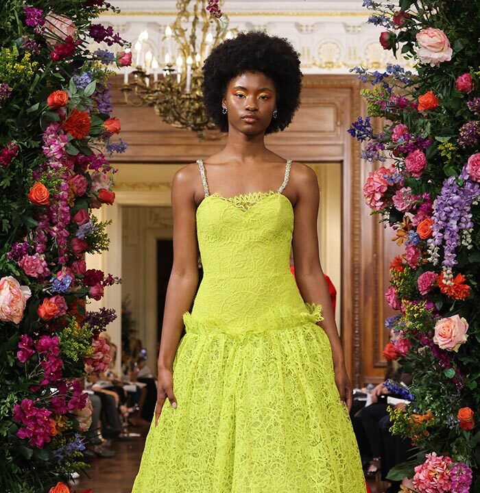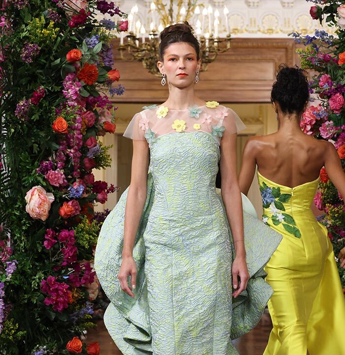 LOOK 53 Blooms and Bliss: A Pink and Chartreuse Green Gown with Sheer Puff Sleeves and Exquisite Floral Beading