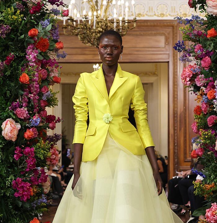 LOOK 48 Sunny Sophistication: A Chic Bright Yellow Silk Mikado Jacket with Floral Buttons, Paired Perfectly with Shorts and a Full Tulle Circle Skirt
