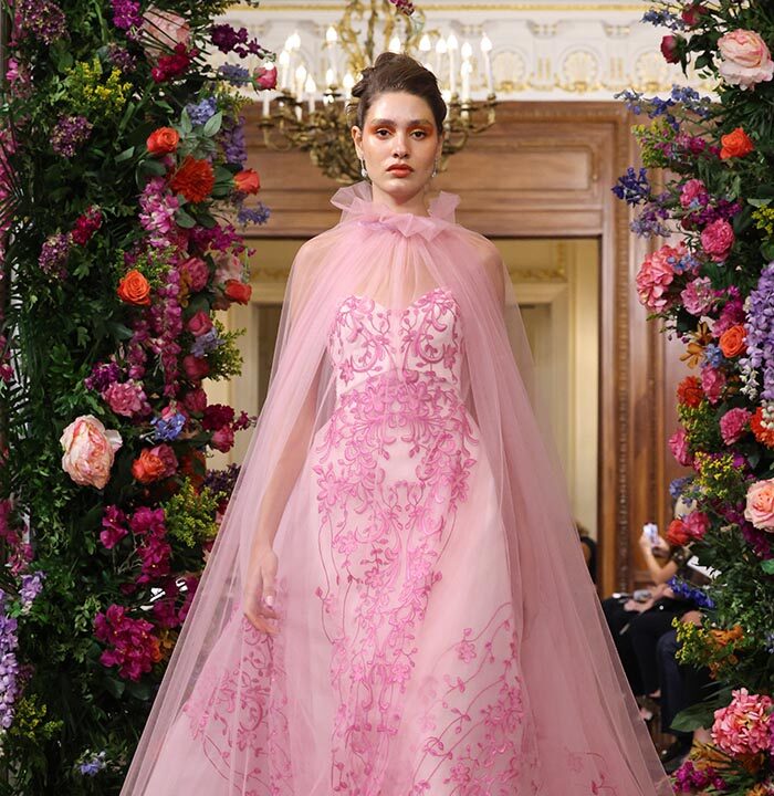 LOOK 52 Bold and Beautiful: A PUNCH PINK Gown featuring a Ruffle High Neck Tulle Cape and Sweetheart Vine Embroidered Bodice