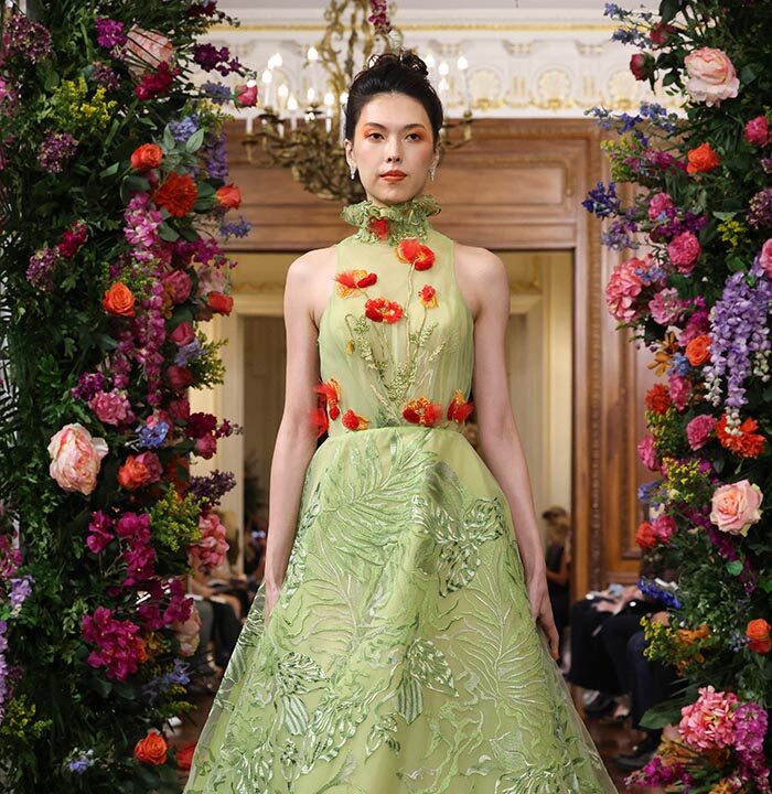 LOOK 54 Venetian Dreams in Parrot Green: A High Neck Ombre Leaf Gown with Enchanting 3D Floral Embroidery