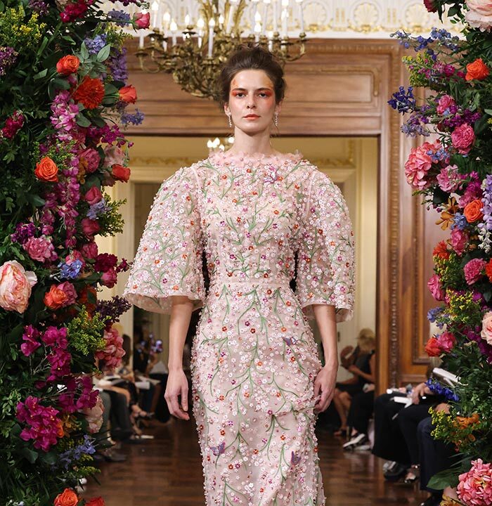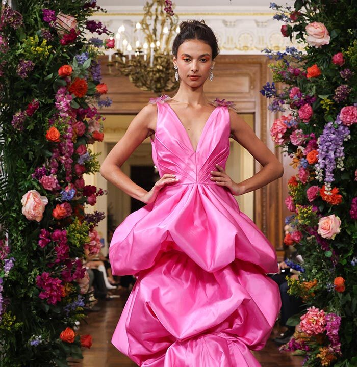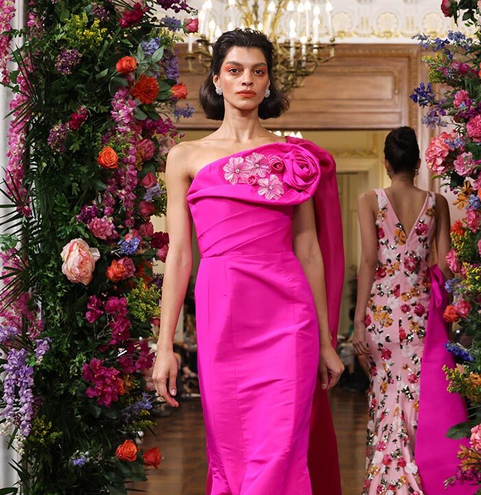 LOOK 60 Blossoms in Pink: A Vibrant One-Shoulder Floral Embroidered Gown Crafted from Luxurious Silk Faille and Satin-Faced Organza, with a Captivating Train