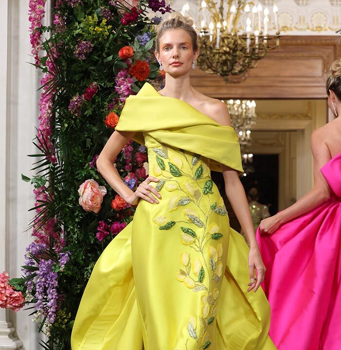 LOOK 63 Sunny Splendor: A Vibrant Yellow Silk Mikado Gown Enhanced with Hand-Stitched Lemon Embroidery