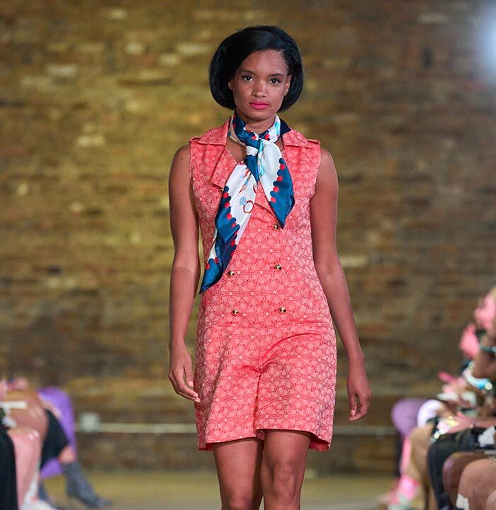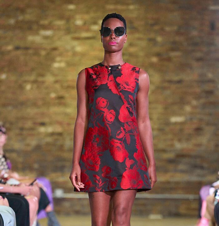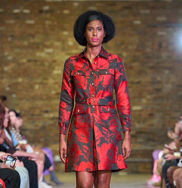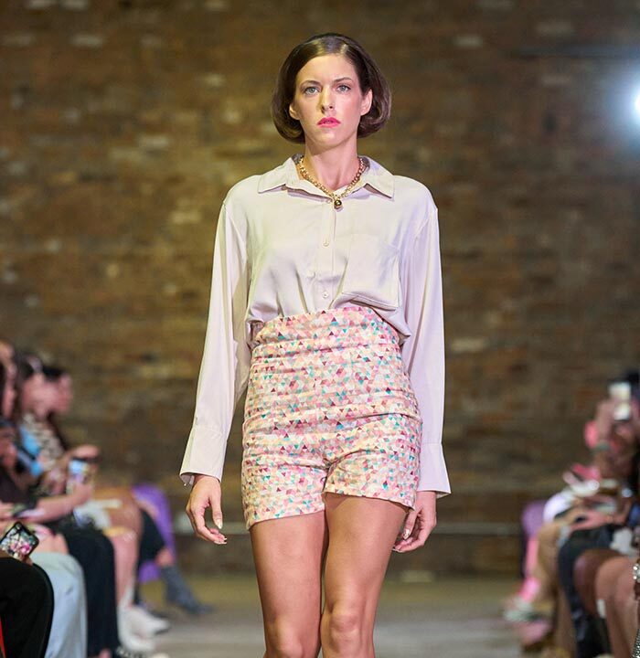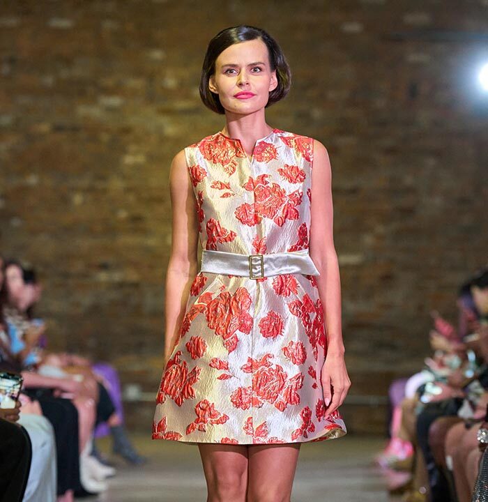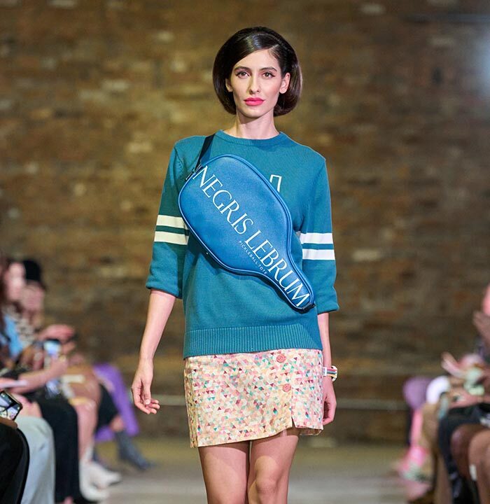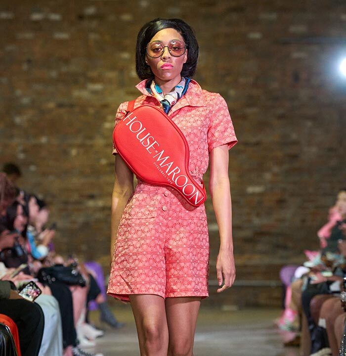 Drawing inspiration from the unmistakable flare of Pan American flight attendants, designer Travis Hamilton reimagined the feminine silhouette, revising mini-dresses, skirts, and rompers in rich, soft floral brocades. An additional feature in this season’s runway show signaled a significant milestone for Hamilton: his whimsical, vibrant, tailored pickleball totes highlighted Negris LeBrum’s unprecedented venture with Texas Southern University (TSU) – House of Maroon.
