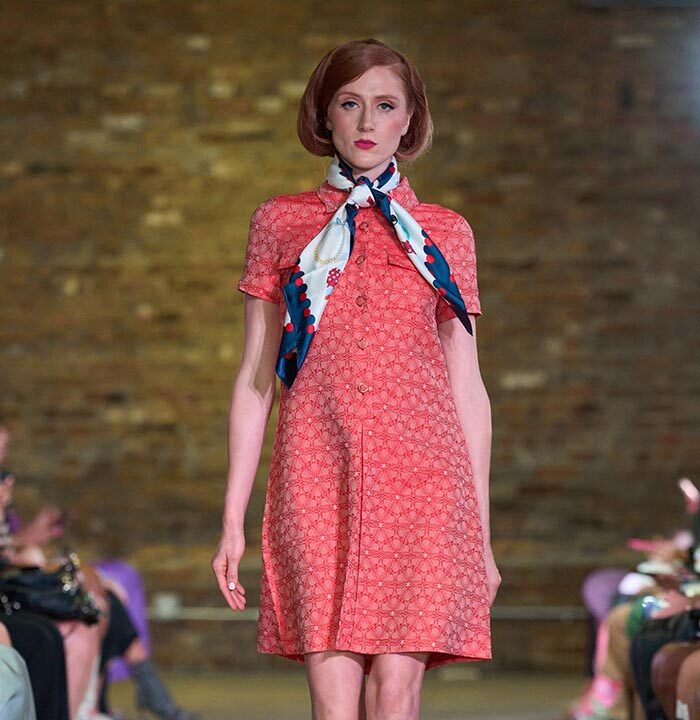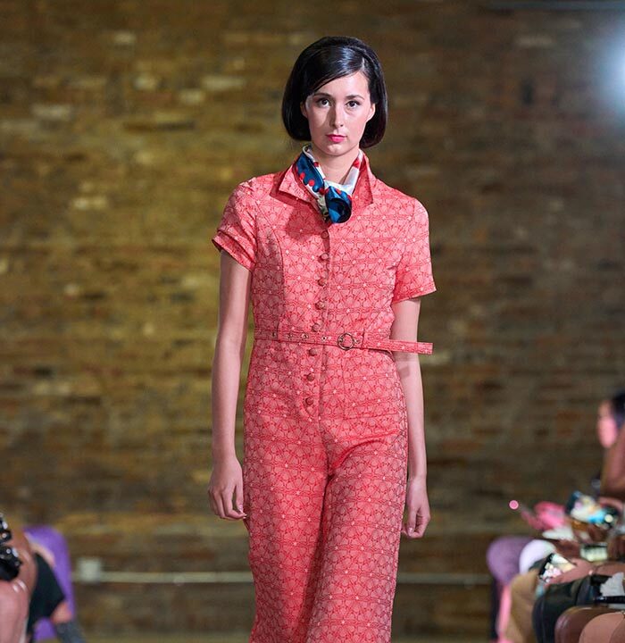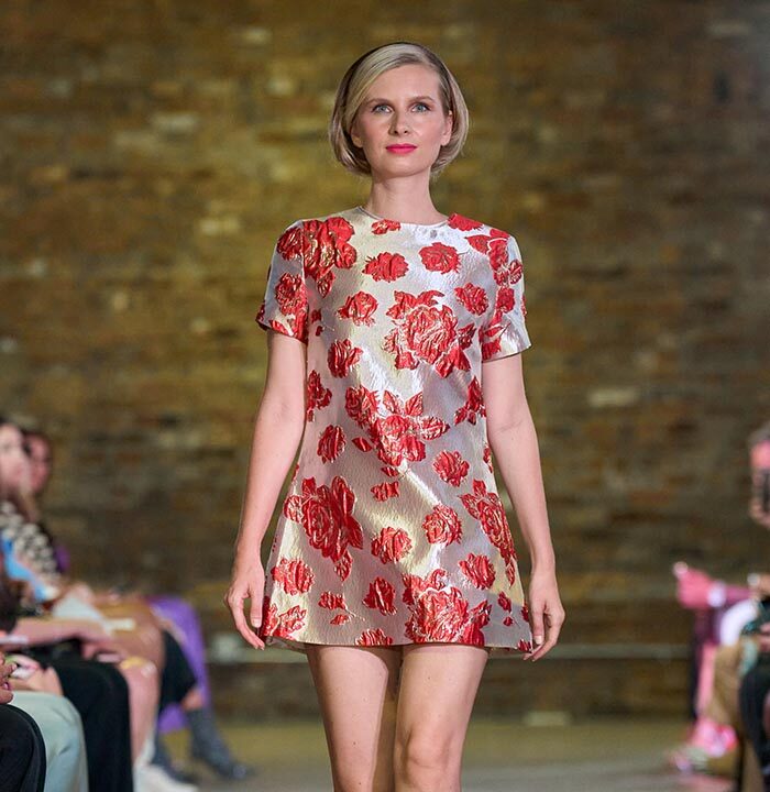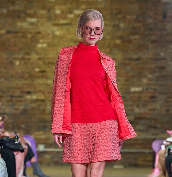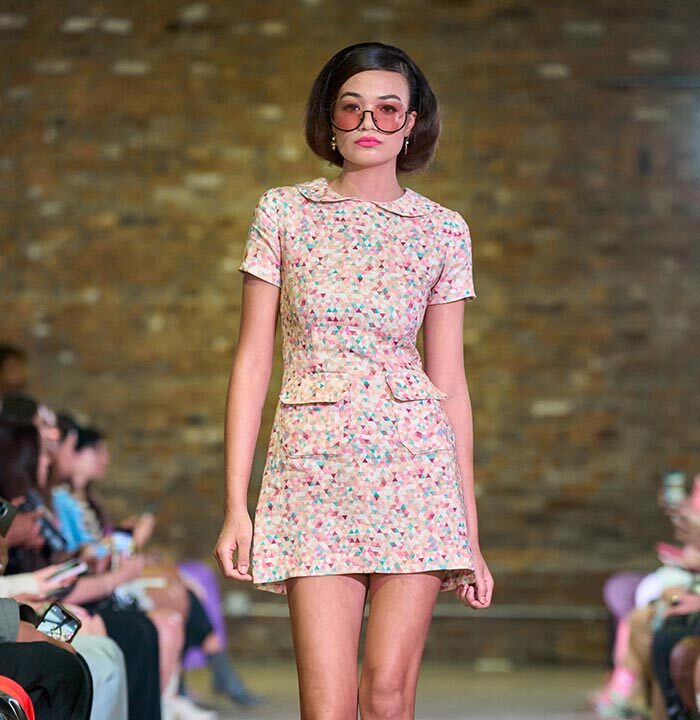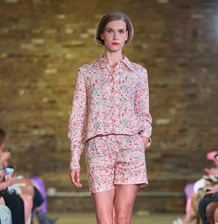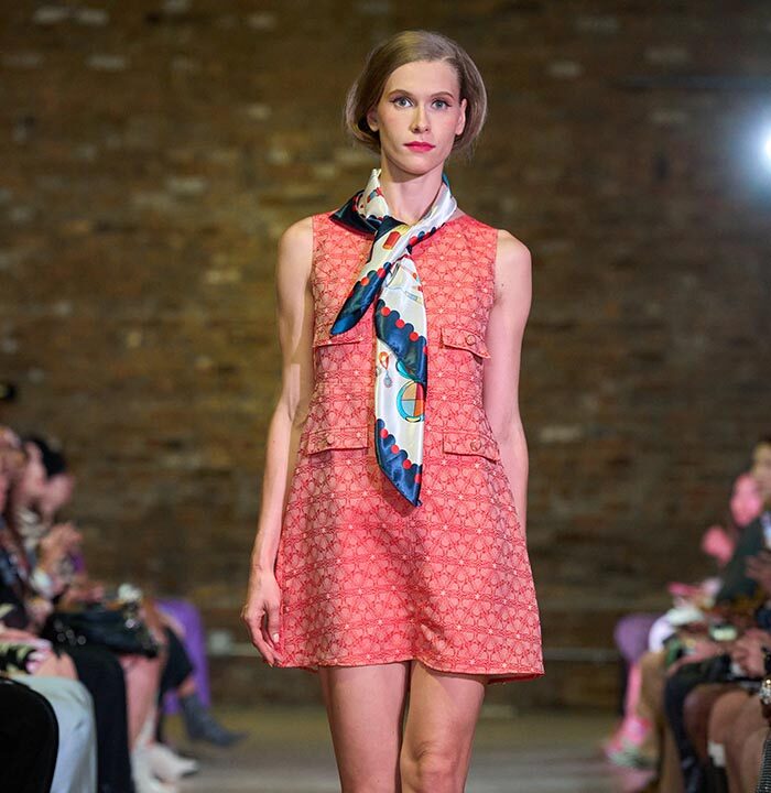 Drawing inspiration from the unmistakable flare of Pan American flight attendants, designer Travis Hamilton reimagined the feminine silhouette, revising mini-dresses, skirts, and rompers in rich, soft floral brocades. An additional feature in this season’s runway show signaled a significant milestone for Hamilton: his whimsical, vibrant, tailored pickleball totes highlighted Negris LeBrum’s unprecedented venture with Texas Southern University (TSU) – House of Maroon.